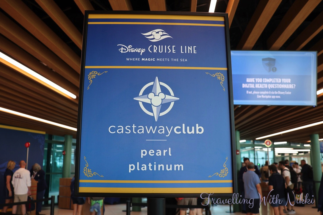 After entering the Disney Cruise Line terminal at 11:05am, we were directed to the separate Pearl and Platinum Castaway Club line where there was only two other families waiting compared to the regular line which was much busier so we only had to wait a few minutes until we were called to one of the desks. As we had checked in online thirty days before our cruise, our passports as well as my US Visa and my boyfriends ESTA (make sure to bring a paper copy of it with you as they do ask for it) were quickly checked and verified with the information in their system before we then joined a short line to go through security before heading up the escalator and entering the main area of the terminal building – it was the complete opposite experience to our last cruise when we boarded at the truly awful City Cruise Terminal in Southampton for our Transatlantic cruise onboard the Disney Dream.