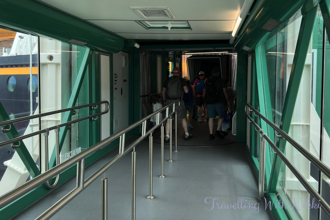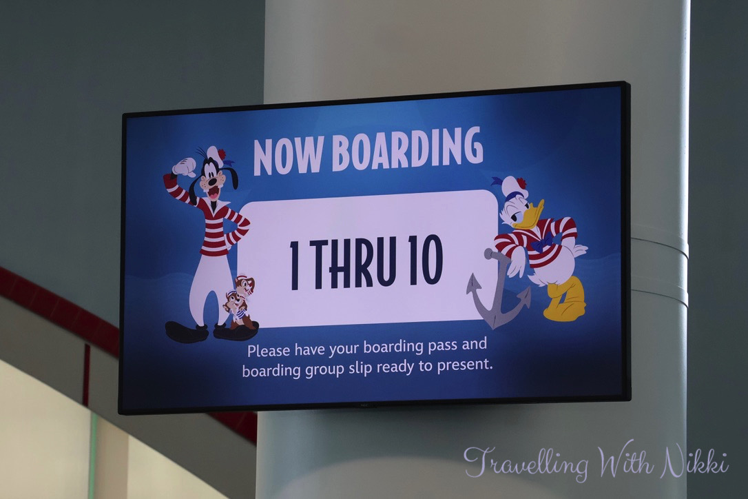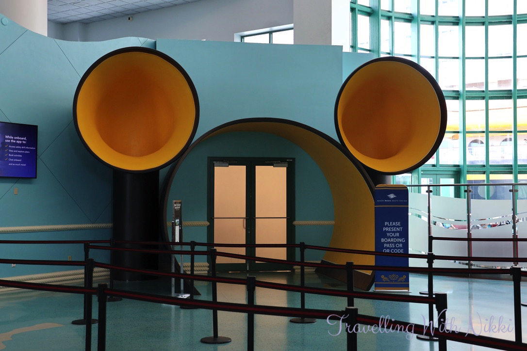 The terminal was starting to look pretty empty at this time when all of a sudden they jumped from Group 7 straight to Group 10 which was called at 12:03pm. We joined the line to board and before we knew it, we were walking through the giant Mickey ear arch where the QR codes from our Port Arrival Form were scanned (we had added these to the Apple Wallet on our iPhones so we could access them quickly when needed) before making our way along the gangway to finally board the beautiful Disney Treasure.