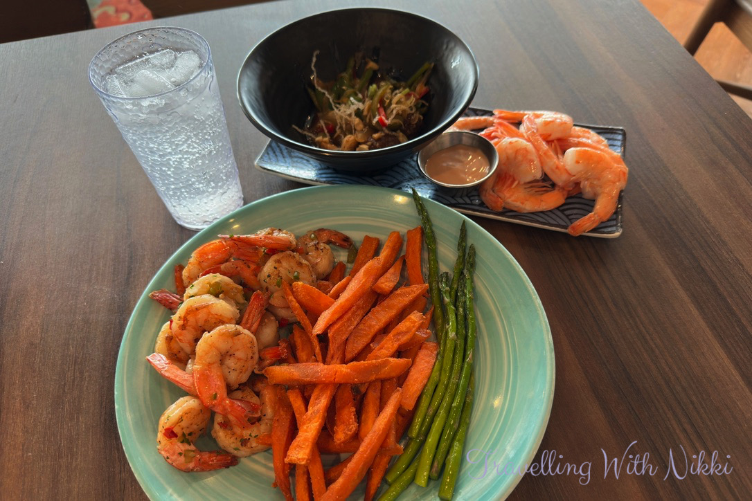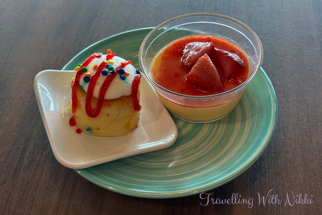 Just as on the Disney Wish, the food at Marceline Market is served to you which I actually prefer as it stops everyone touching the serving utensils and feels so much more hygienic especially when you see some people not even want to wash their hands when entering. For my lunch I got a small portion of the Plant Based Beef Stir Fry and also asked for a few Shrimp and was given a giant plate of them but I was not complaining in the slightest as they tasted so good along with some Asparagus and Sweet Potato Fries on the side. To finish I had my favourite Celebration Cake and Strawberry Creme Pot which I always look forward to on every embarkation day.