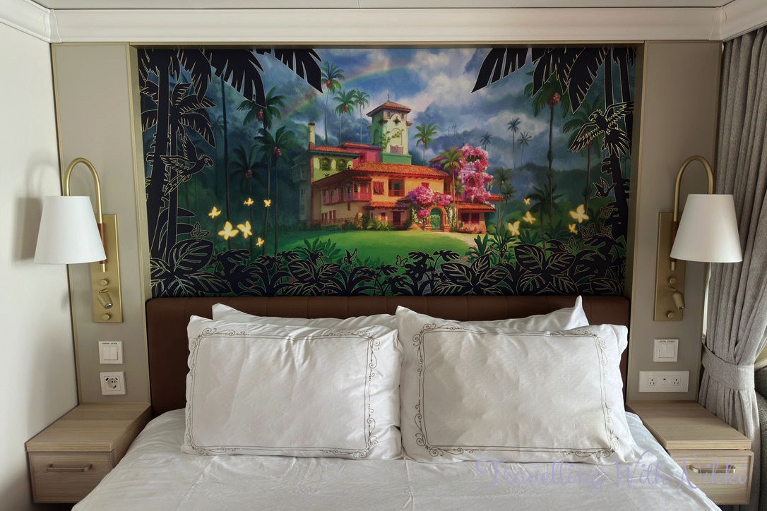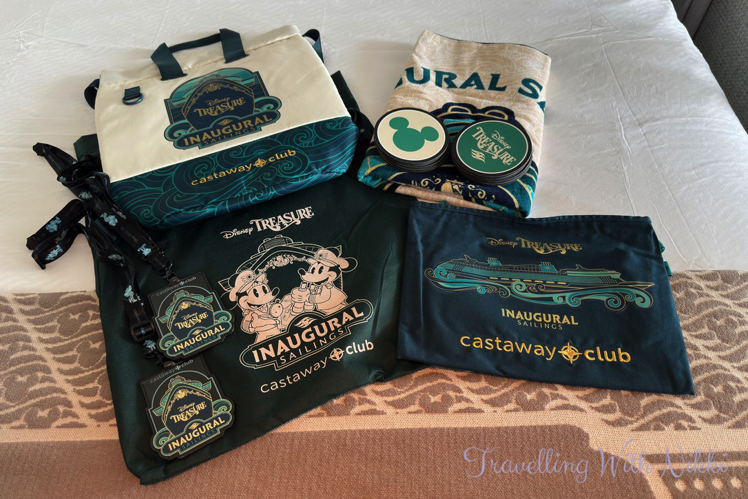 Our Key to the World cards were waiting for us in a sealed envelope outside the door and I was overjoyed not only by having an beautiful Encanto-themed room but also by the sight of all of the Disney Treasure Inaugural Sailing welcome back gifts that were waiting for us as Platinum Castaway Club members which included lanyards, a bag, a laundry bag, towel bands, a wet/dry bag and a beach towel which also doubles as a game of Noughts and Crosses (or Tic Tac Toe as it is known in the US) which is what the round game pucks that are also in the bag are for – they are not drinks coasters as so many other bloggers and vloggers have incorrectly stated.