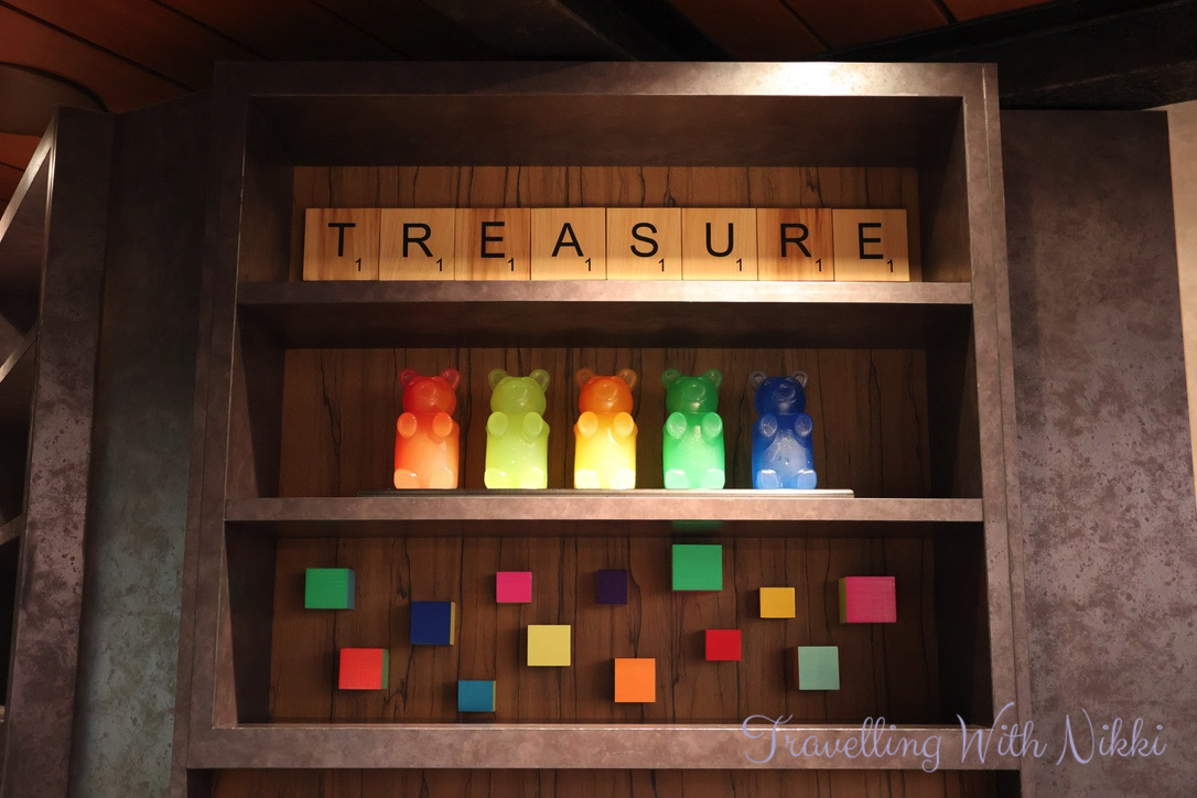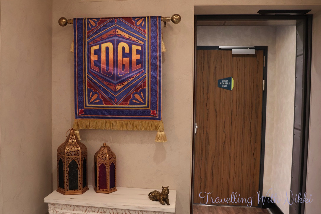 As we still had some time before the Muster Drill which was due to start at 3:55pm we decided to explore the ship starting with Edge on Deck 5 Aft which was in Open House at this time and I loved the Arabic lamps outside the door along with the Scrabble tiles on one of the shelves inside spelling out “Treasure” and the old stereo with a “Cosmic Mix Vol. 1” cassette (from Guardians of the Galaxy) inside.