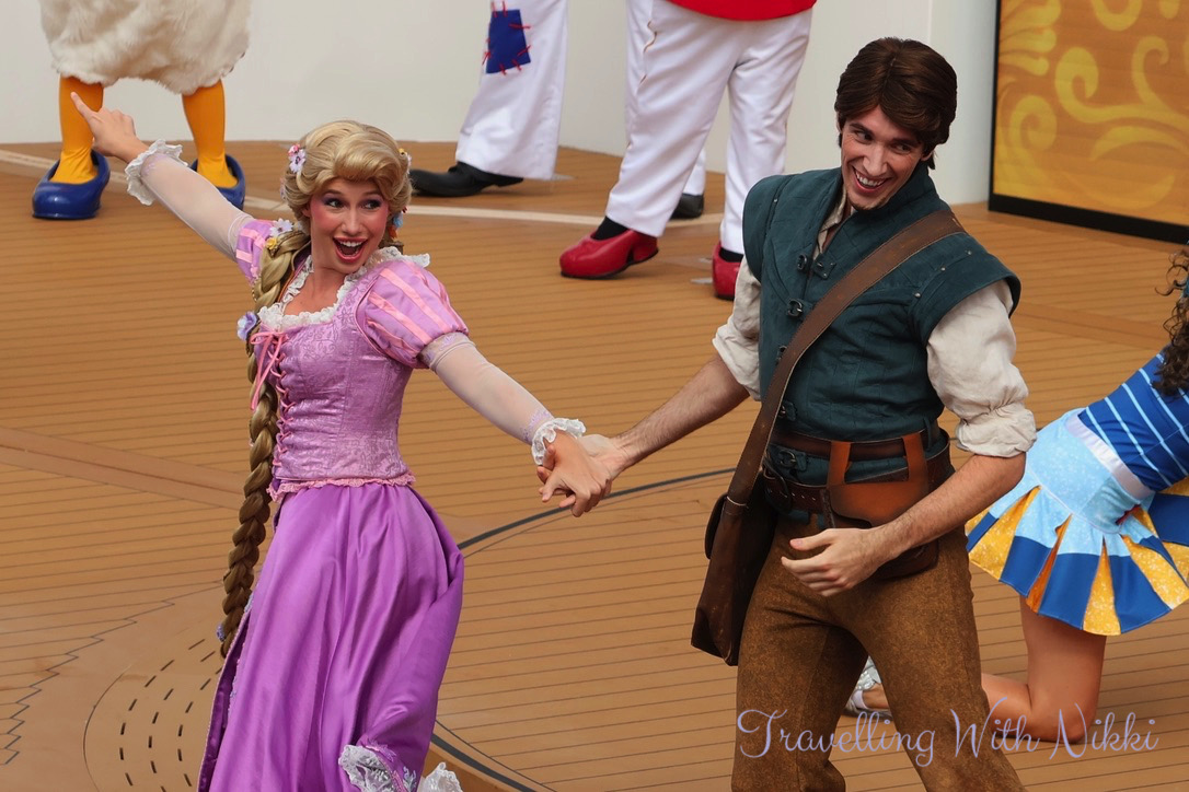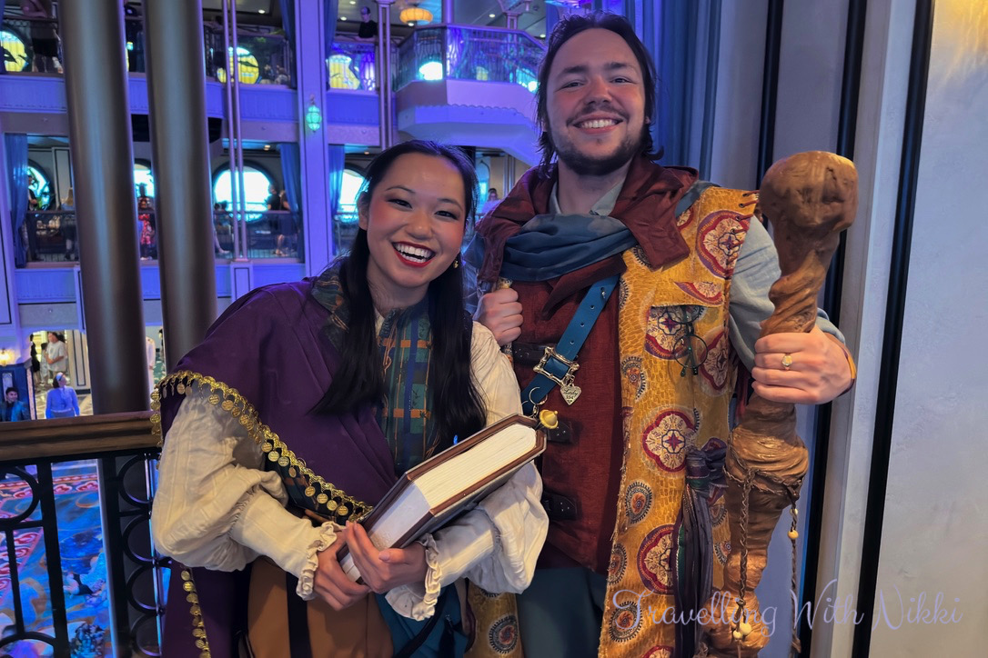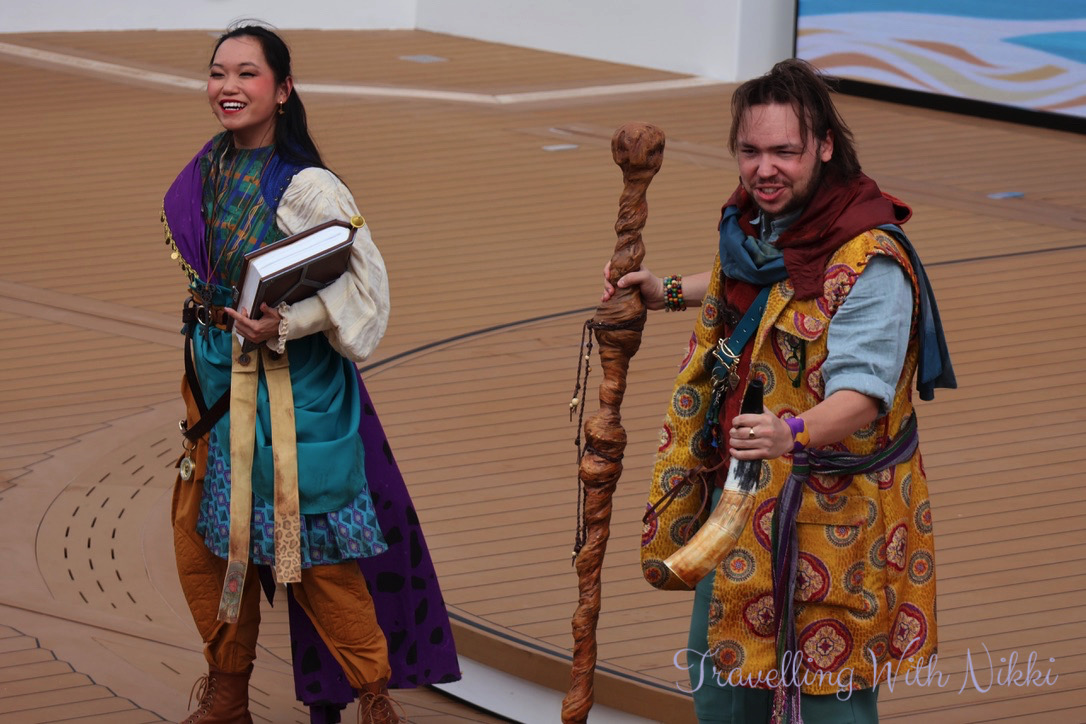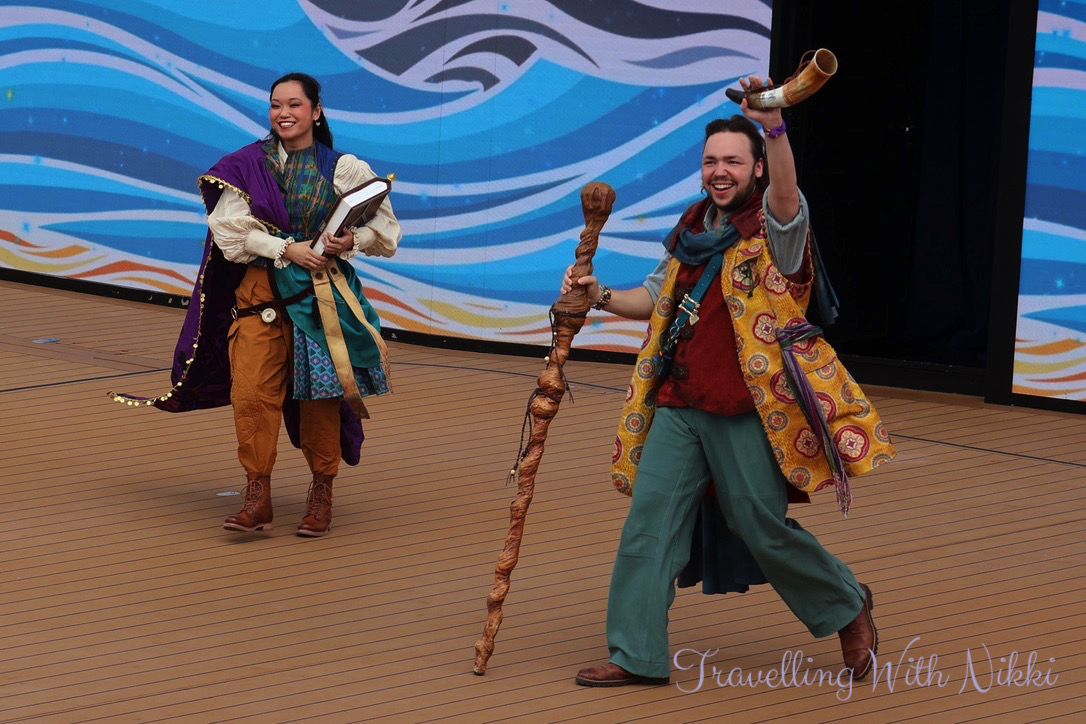 To begin the sailaway party we were introduced to Coriander and Sage who are two new original characters exclusive to the Disney Treasure. They are the Treasure Sea-kers and the storytellers of the ship who would be with us during our time onboard and help us discover the treasure that we were all looking for – whether it be a chest of gold hidden in a pirates cove, endless riches piled high in a far off Cave of Wonders, a priceless artefact hidden deep in an ancient temple or maybe a treasure even greater.