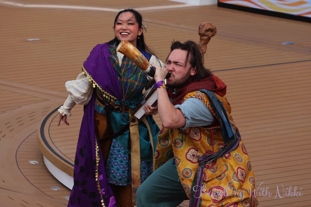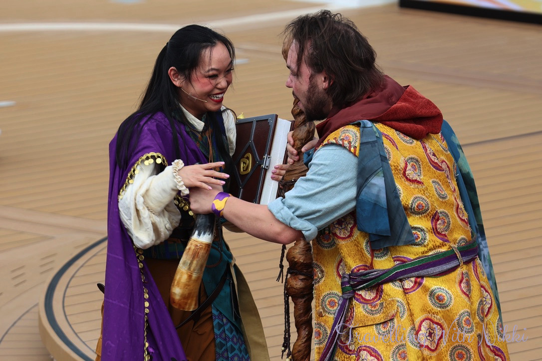 As we were watching the show, we also happened to be in the right place at the right time to meet Coriander and Sage for the first time as they were walking around Deck 4. We were able to chat with them for a few minutes and talked about many things including monkeys, going on different adventures as well as exploring the world. They also told us to not miss Choose Wisely: An Indiana Jones Comedy Adventure in a few days time.