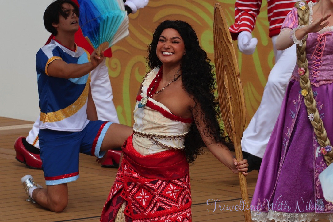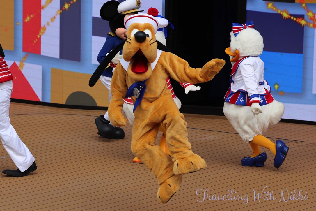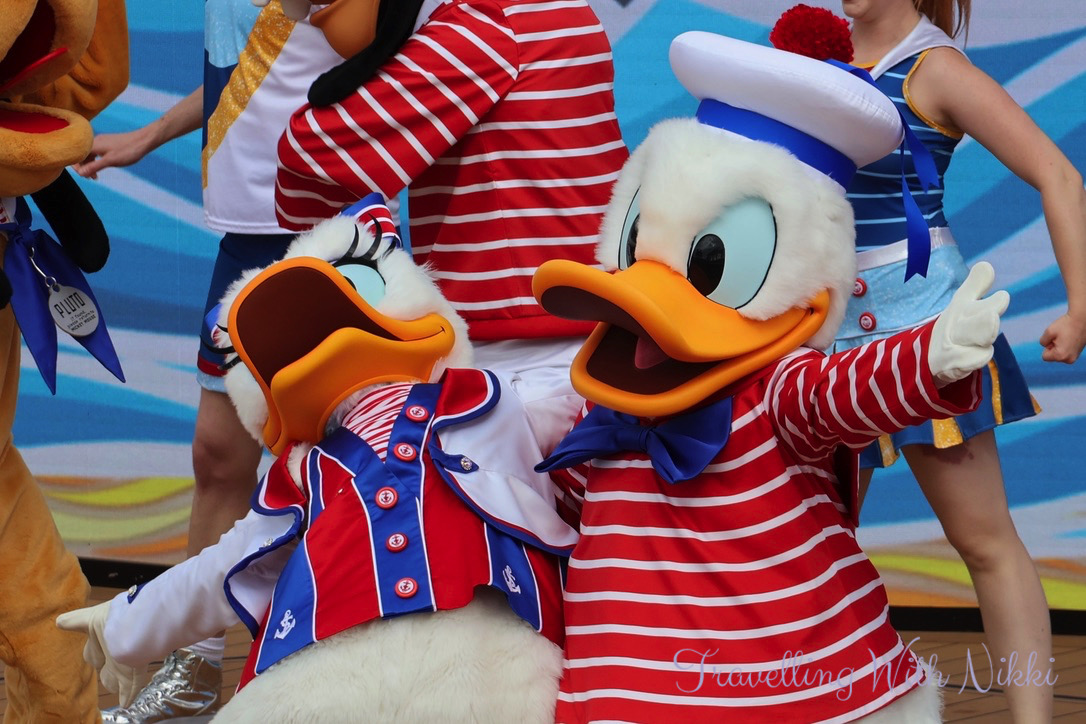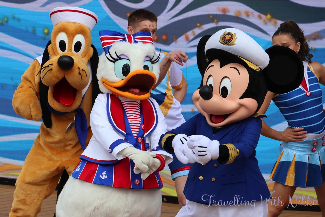 Captain Minnie, Captain Mickey, Donald, Daisy, Goofy and Pluto arrived on stage to begin the party and Let’s Set Sail onboard the Disney Treasure is nearly identical to the Set Sail on a Wish sailaway party onboard the Disney Wish albeit with one or two tiny lyric changes throughout.