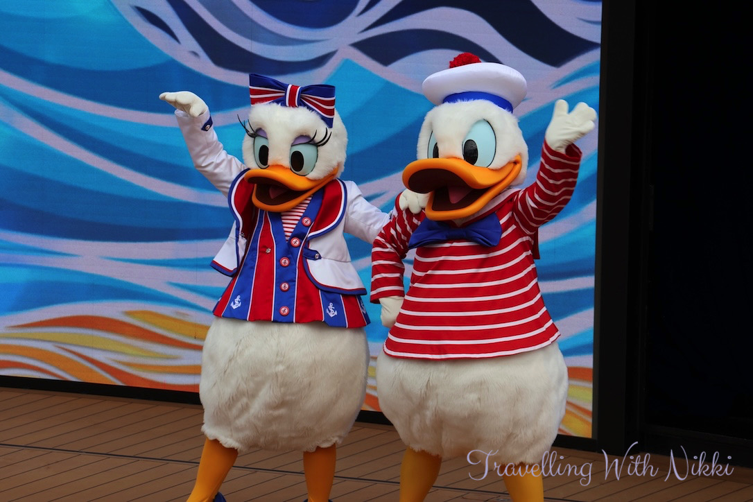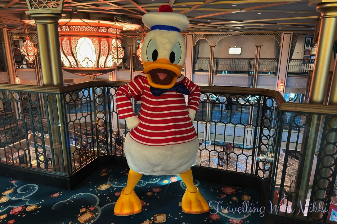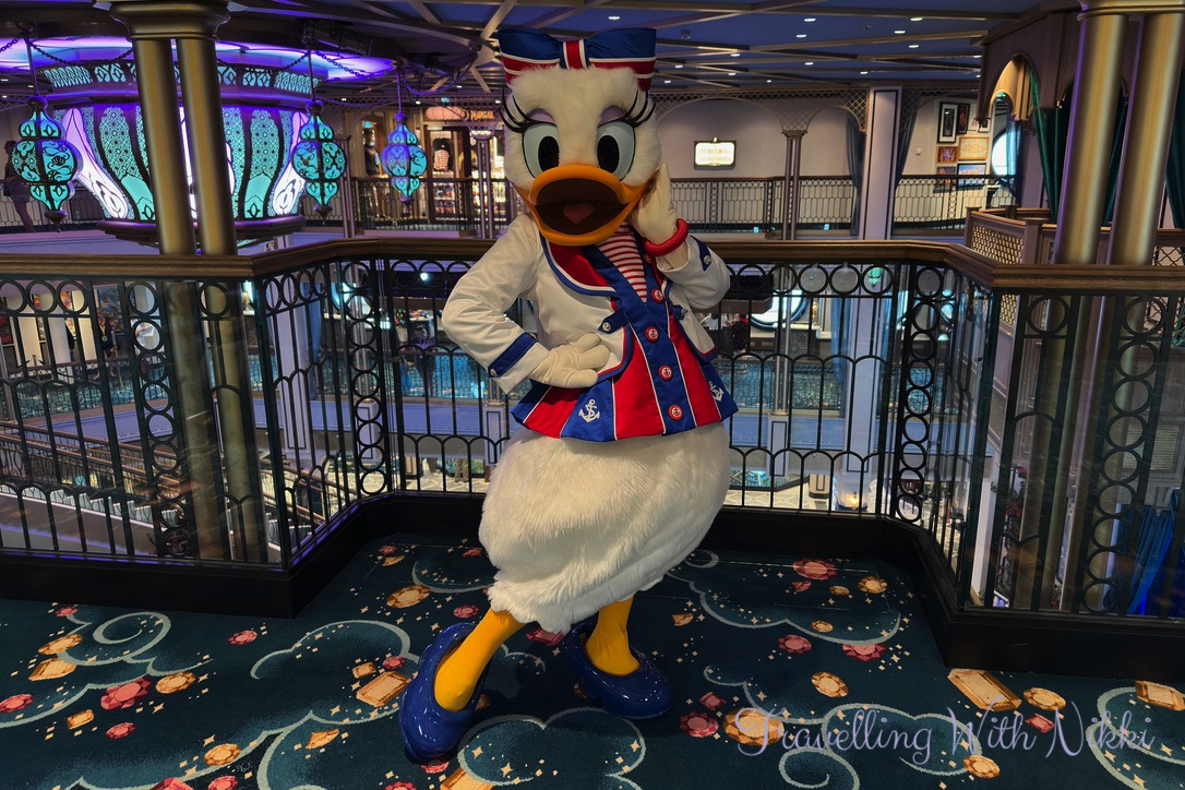 With coffee in hand, we walked back through the Grand Hall to see Daisy Duck who was standing on Deck 5 with absolutely no one in line waiting to meet her! It was so strange to see as the lines to meet characters on the first evening onboard are usually so long and I was expecting them to be the same on this night given how crowded the ship seemed to be for the sailaway party but it was actually the complete opposite. I did not even have my big camera with me as we were only planning on going for a walk to Mickey’s Mainsail and to get a coffee but thankfully my iPhone camera saved the day.