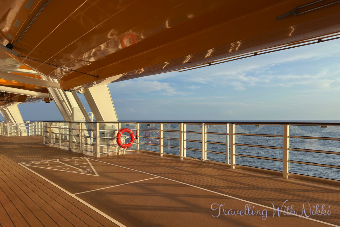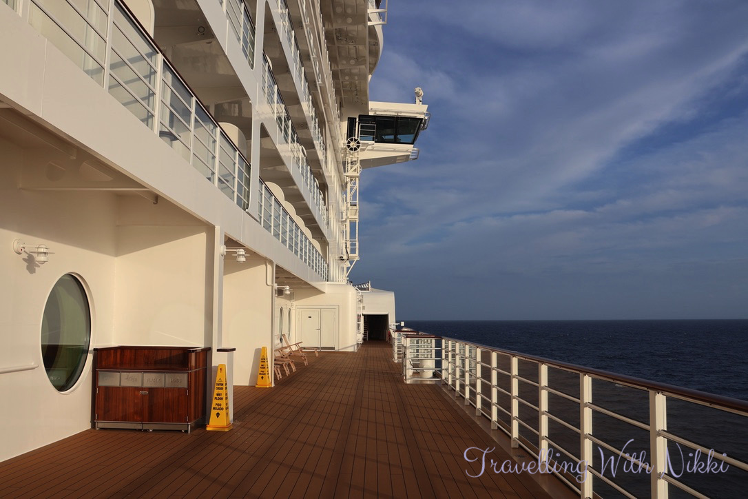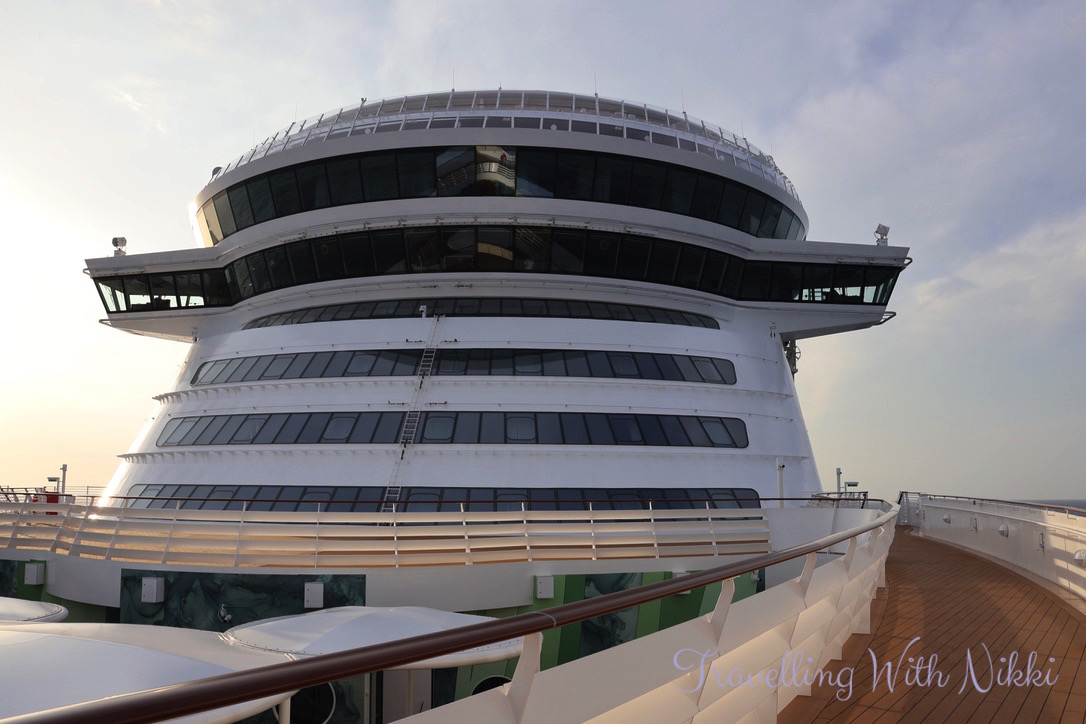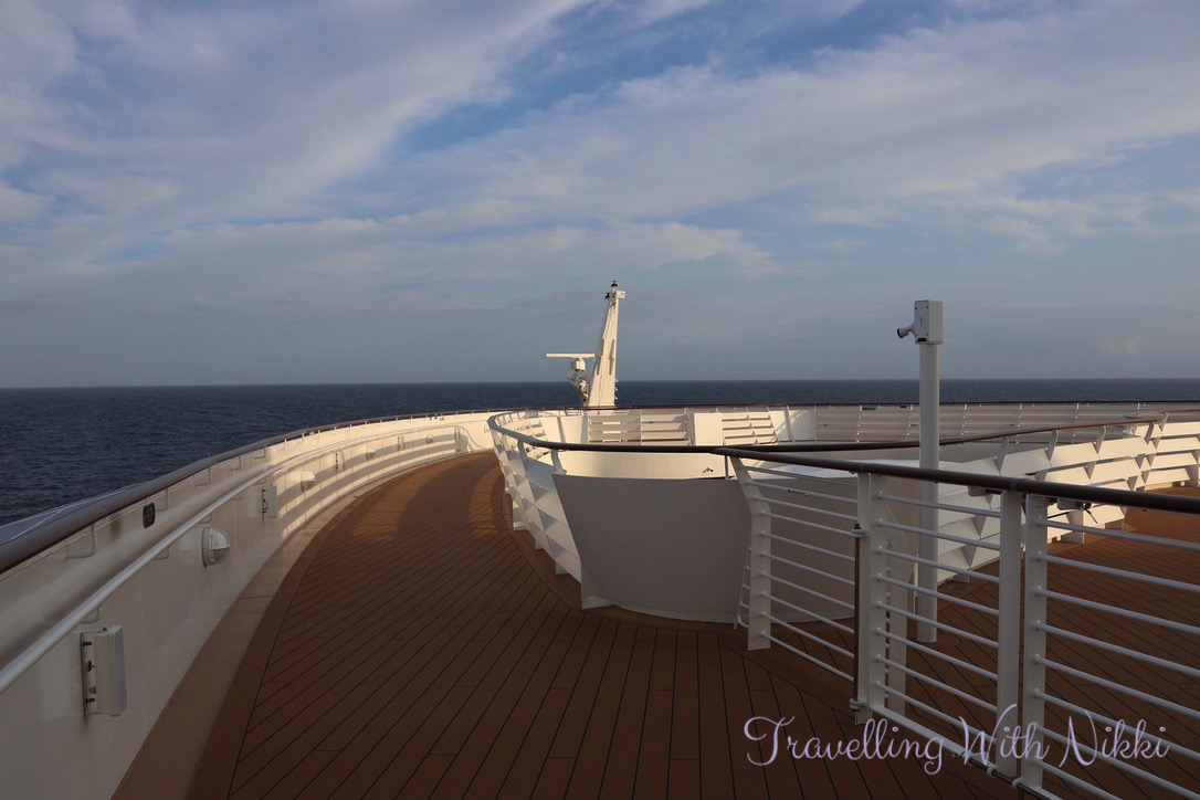 We also decided to walk out onto Deck 4 to get some fresh air as it was so hot inside the ship (it did thankfully cool down for the rest of the cruise) and we even walked out onto the bow of the Disney Treasure which you can access from sunrise to sunset (except during bad weather) and even when the ship is out at sea unlike a certain Disney vlogger annoyingly and incorrectly states time and time again.