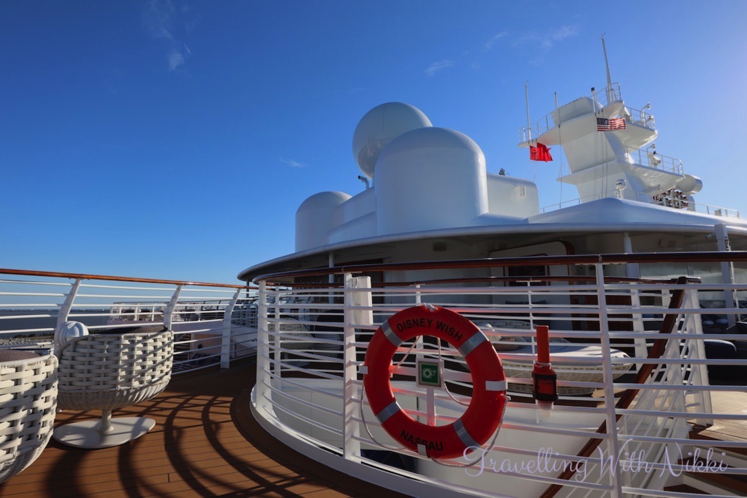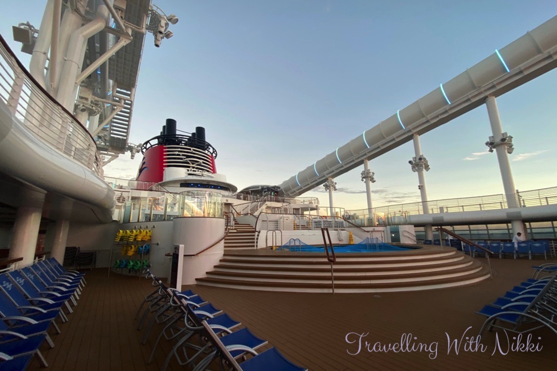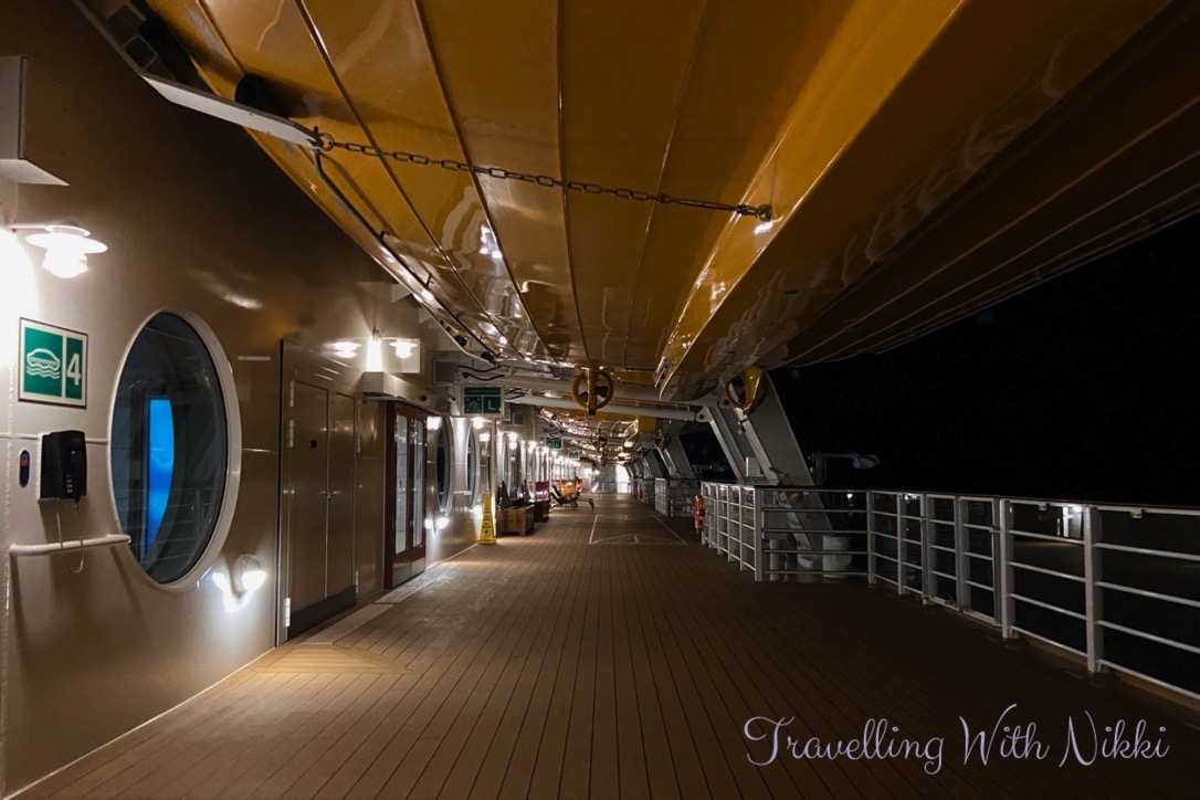 After watching the Kiss Goodnight in the Grand Hall, we went out onto Deck 4 and walked around as much of the deck as we could which was not far at all as you cannot walk a complete lap of the ship which is something that I really missed being able to do onboard the Disney Wish – even the walk out around the bow of the ship is closed as soon as it gets dark.