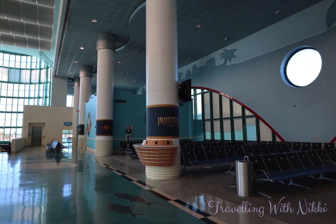 We were standing outside the front of the terminal in Port Canaveral just under ten minutes after we had disembarked the Disney Wish. After stopping to take a few photos we walked straight back inside where there was no else waiting to check in and went through security once again before taking the escalator up into a nearly empty terminal.