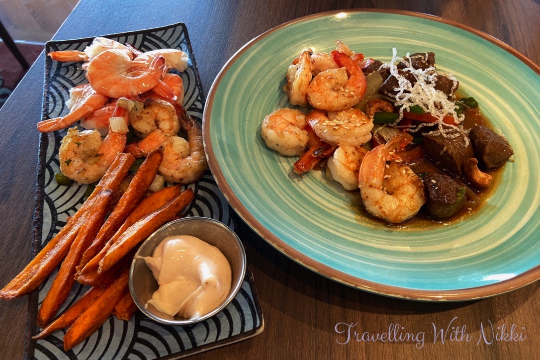 At Midday we walked back to Marceline Market to get some lunch as soon as it opened and we found a nice quiet corner inside to sit down and eat. As we had dinner at Enchanté booked for that evening, our plan was to have a slightly bigger lunch as early as possible so that we would have no need to snack during the afternoon. I decided to try all of the different Shrimp that they had along with some Sweet Potato Fries and a Plant Based Beef Stir Fry which was absolutely delicious – I really hope that all of the amazing plant based options that I tried on the Disney Wish that week make it to the other ships as it really was so good and such a nice change to have a lot more non meat options available.