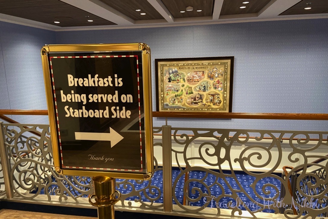 The Starboard side of Marceline Market was open for breakfast and even though there are limited food selections available on disembarkation day, there was still a lot more choice than on our last cruise on the Disney Dream. It was extremely busy and crowded that morning and finding an empty table inside took a few minutes (it was a little too cold and windy to sit and eat breakfast outside at this time) but we eventually found a table in one of the “hidden” areas near the entrance to Marceline Market.