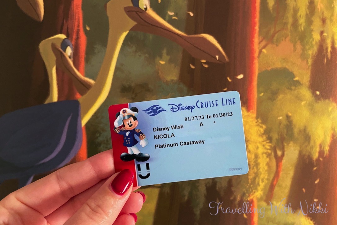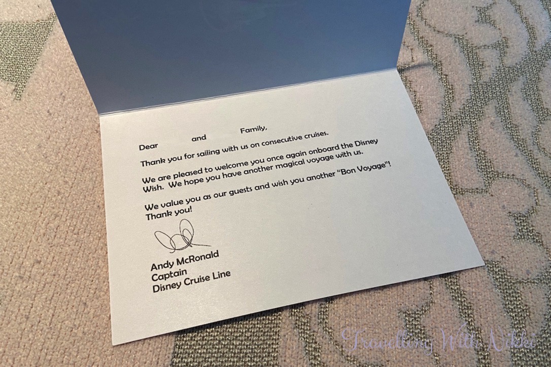 As we were sailing Back to Back and staying in the same stateroom for both cruises, we were able to access our room at 1:00pm before everyone else – all we had to do was walk under the barrier. We dropped off the few bits that we had with us and collected our new Key to the World cards that were in an envelope outside our stateroom door along with a card from Captain Andy thanking us for sailing on Back to Back cruises and welcoming us back onboard the Disney Wish.