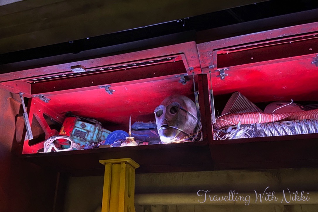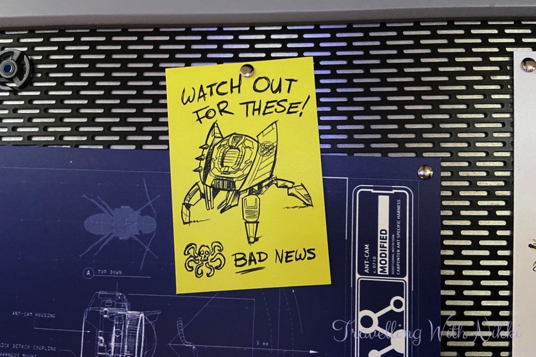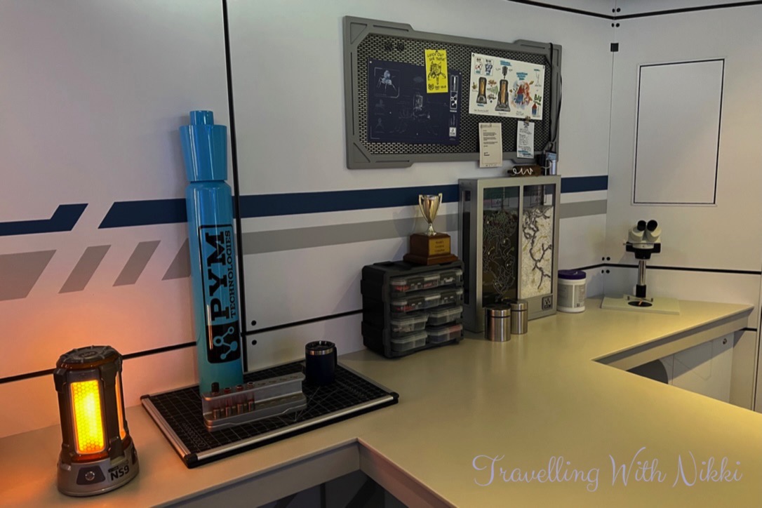 There is also a yellow piece of paper on the noticeboard with a drawing of a Swarmbot saying “Watch Out for These” and “Bad News” which is a reference to the Ant Man and the Wasp: Nano Battle attraction at Hong Kong Disneyland as well as an EMP Blaster gun in a storage case on the desk from the same ride.