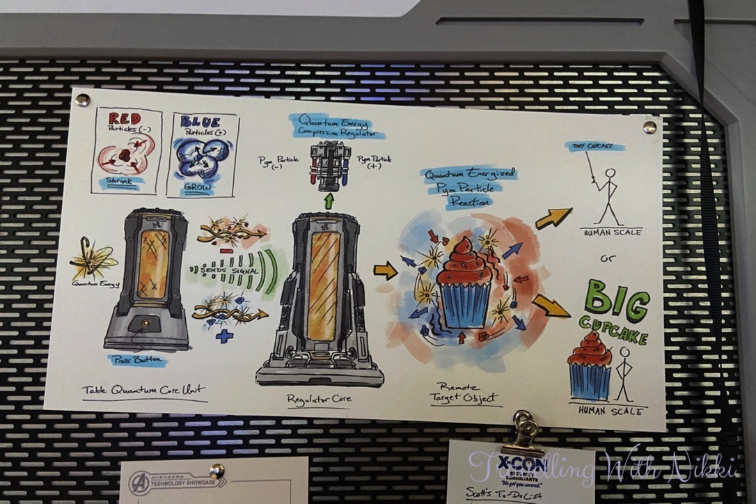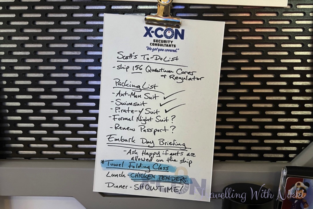 Scott Lang’s Key to the World is also on display along with his “World’s Greatest Grandma” trophy that was given to him by his daughter Cassie for his birthday. However it is Scott’s packing list which is written on X-Con Security Consultants notepaper that contains even more details related to both the Quantum Encounter dinner as well as the cruise itself. As well as packing his Ant Man suit, a swimsuit, a “Pirate-y” suit and a formal night suit, there is also a reminder for him to ship the 156 Quantum Cores and the Regulator which are found on all of the dining tables inside the Worlds of Marvel restaurant. Scott has also written down that he wants to do a towel folding class onboard as well as get Chicken Tenders for lunch which are both references to the Quantum Encounter dinner as well.