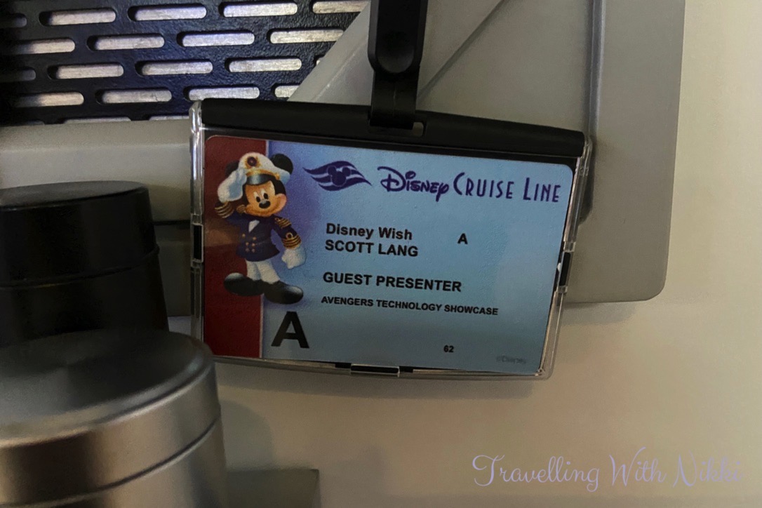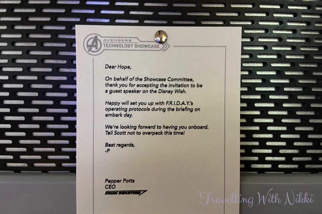 On the noticeboard is a letter from Pepper Potts at Stark Industries to Hope Van Dyne and Scott Lang thanking them for accepting the invitation to be guest speakers onboard the Disney Wish – as well as reminding Scott not to overpack which is funny as during the presentation at dinner, he wants to shrink his suitcase as it is too big to fit underneath the bed in his cabin!