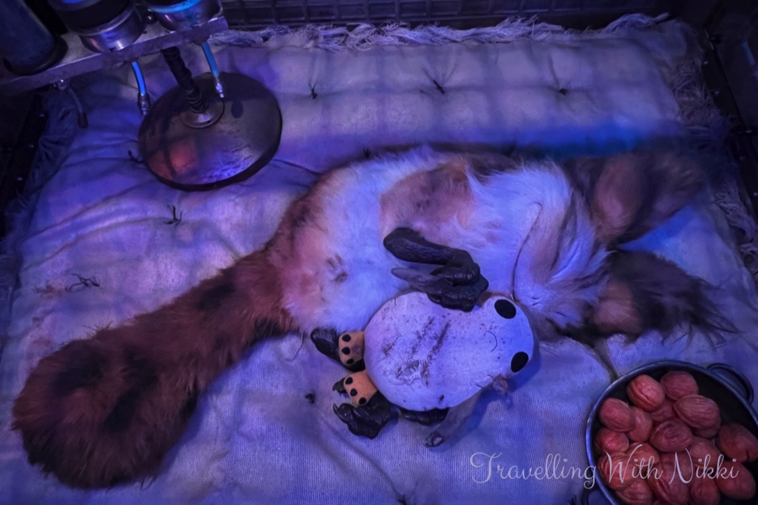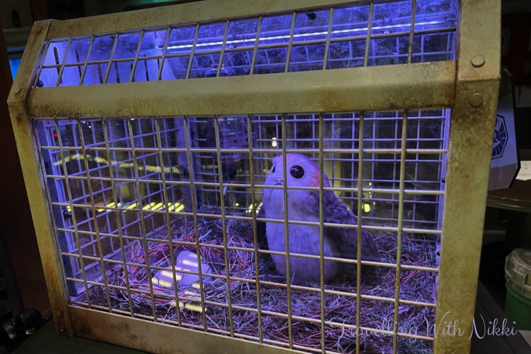 There are various creatures to be found throughout the Star Wars Cargo Bay including a Worrt from Tatooine, a Dokma from Atollon, a Loth-Cat from Lothal holding onto a cuddly Porg as it sleeps as well as an actual Porg guarding a nest of eggs.