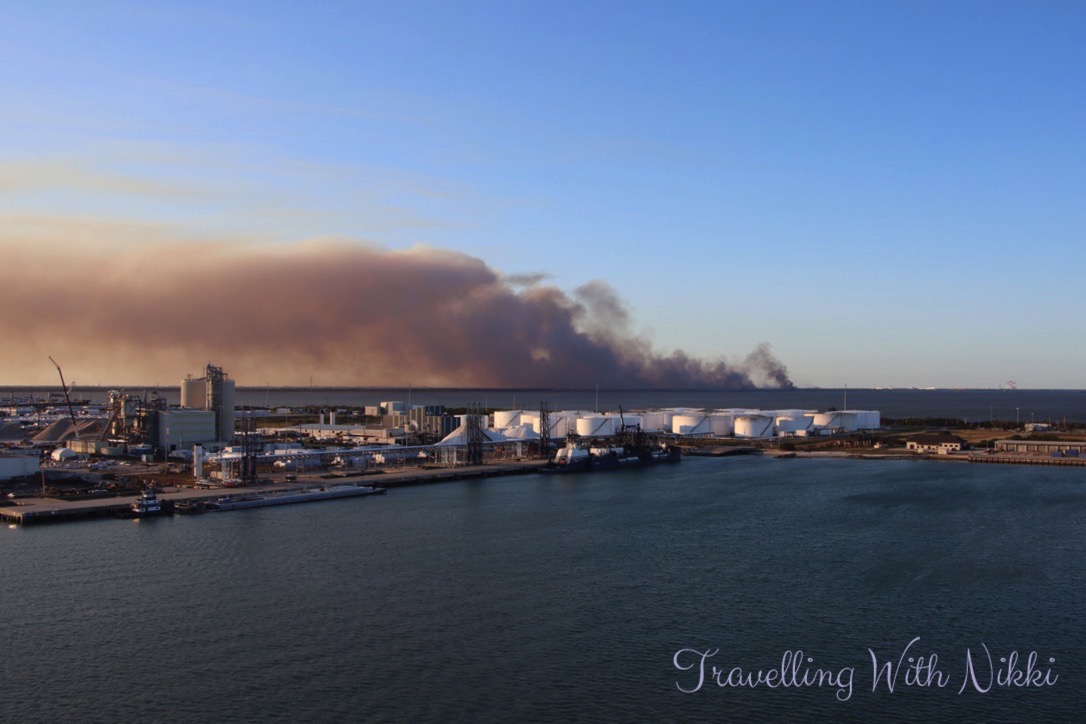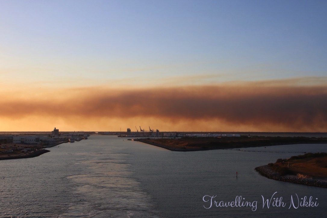 As we had some friends and family watching the Port Canaveral Webcam that afternoon, as soon as Set Sail on a Wish had finished we walked over to the side of the Disney Wish to wave at the webcam which is located on the top of Fishlips Waterfront Bar and Grill. We also walked to Deck 13 Aft as we noticed that there was something on fire at Cape Canaveral and the resulting smoke and haze on the horizon was looking very dark and mysterious.