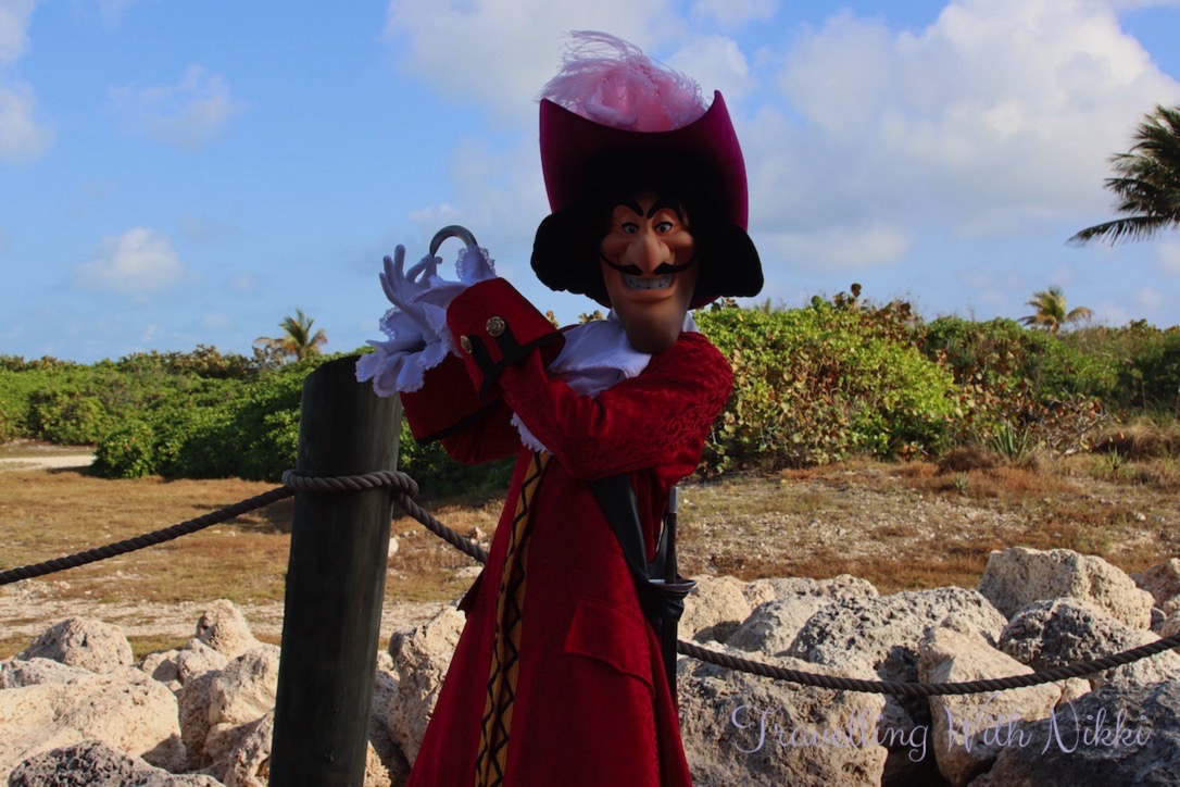 After finishing our cocktail at 3:30pm, we once again took the tram from Pelican Point back to the Disney Wish to save our feet where we met Captain Hook who was meeting by the gangway and guarding the entrance to his ship.