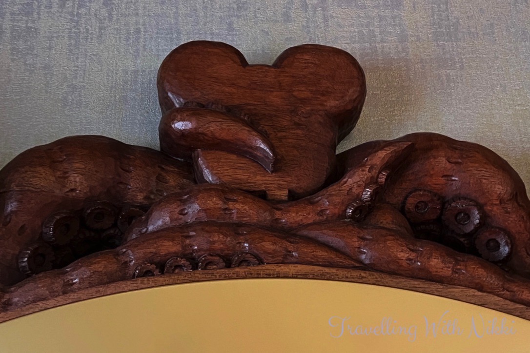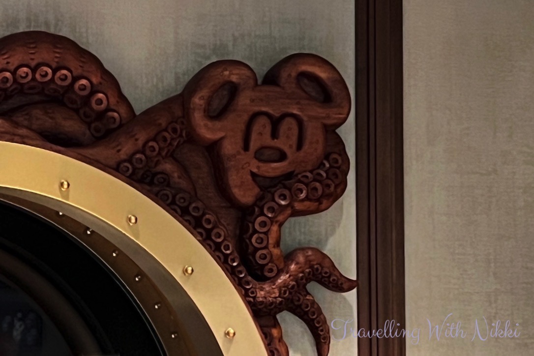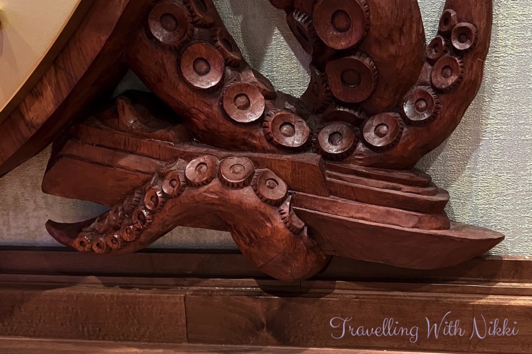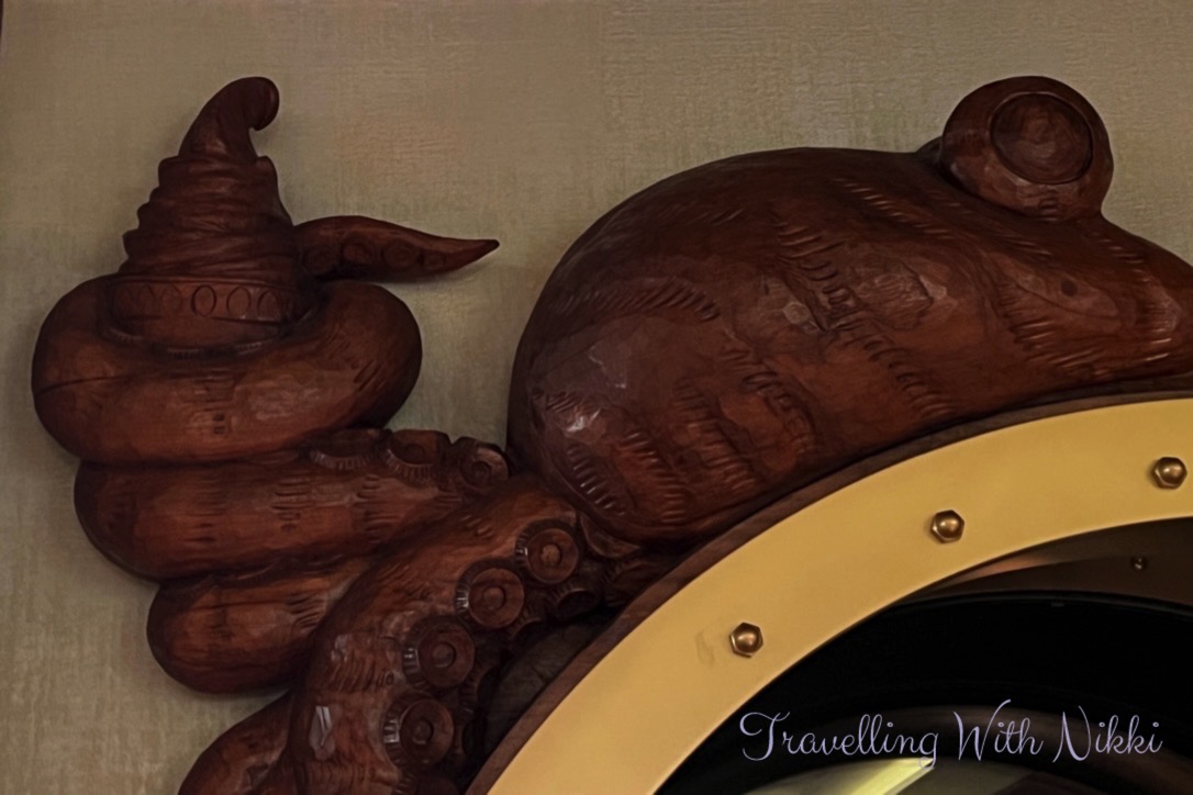 Each porthole window at the Keg and Compass is surrounded by a giant wood carved octopus and if you look carefully each one is holding something different including a Mickey Waffle, a Mickey Ice Cream Bar, a Dole Whip as well as the Disney Wish herself!