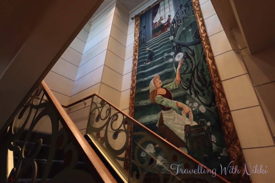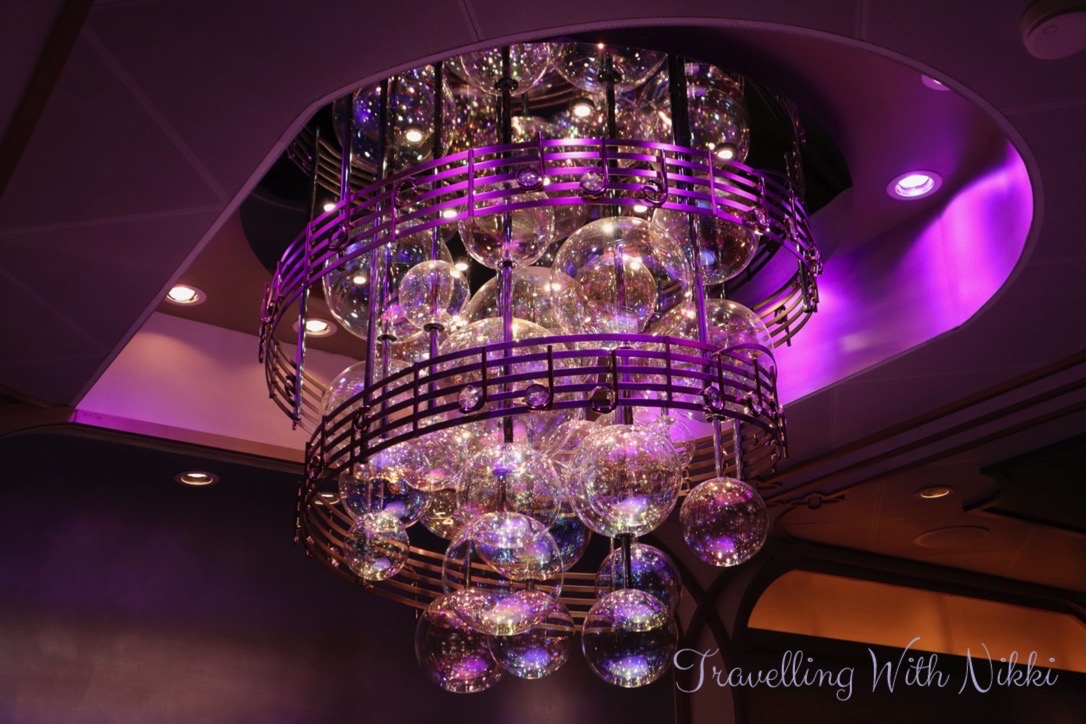 Hanging on the wall outside the bar by the staircase that leads from Deck 3 to Deck 4 is a tapestry showing that exact scene from the film and inside the bar, the chandelier represents the soap bubbles that float into the air as Cinderella washes the floors and the notes that wrap around the outside of the chandelier are the actual sheet music for the song.