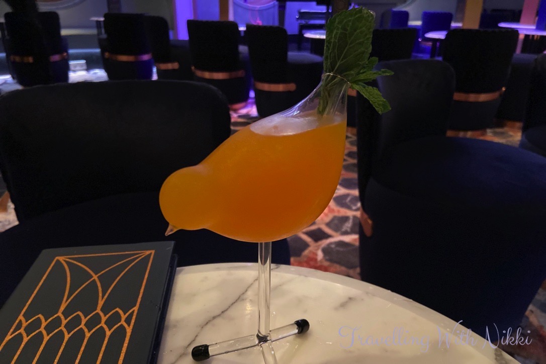 I ordered the Sweet Nightingale (what else?) cocktail which is made from Hendricks Amazonia, Passion Fruit, Rosemary and Mint and served in a bird glass and it tasted heavenly. Though I will say that the glass made me very nervous as it was so delicate and fragile – we joked with the crew when I handed the glass back once I had finished and they said they currently only had four bird glasses left onboard due to breakages or people taking them home.
