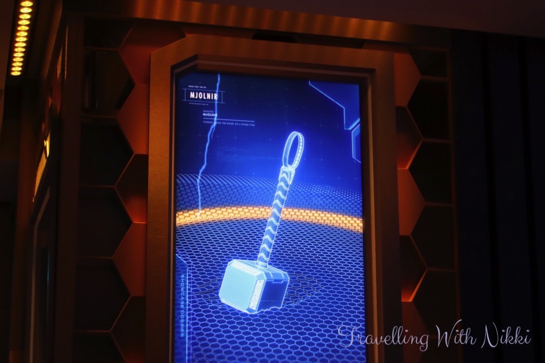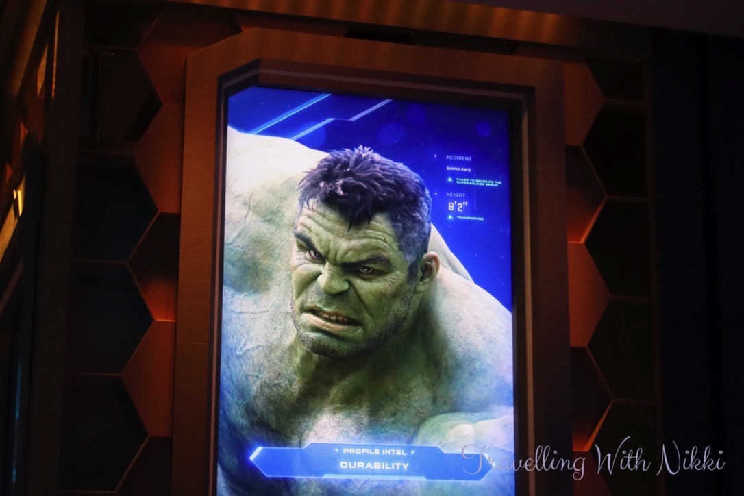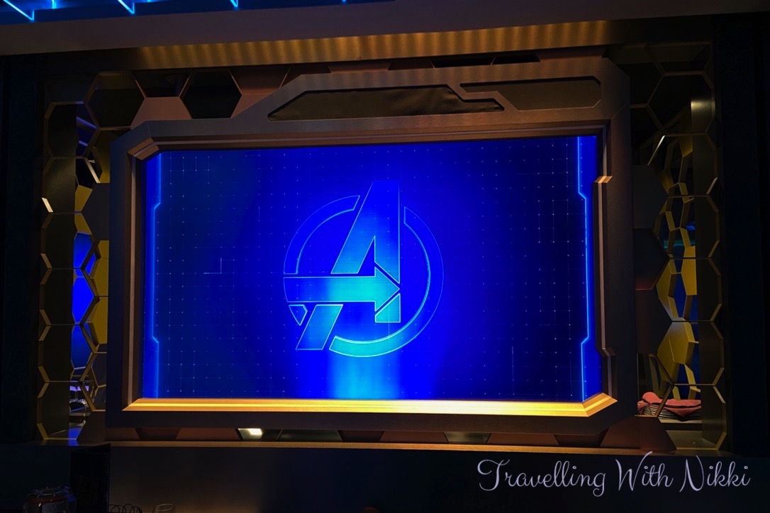 As we were eating our meals and whilst Ant Man was trying to fix the Quantum Core Regulator whilst also accidentally shrinking the Disney Wish in the process, all of the screens around the restaurant show clips from the Marvel Cinematic Universe movies, different character profiles as well as a showcase of various Avengers technology.