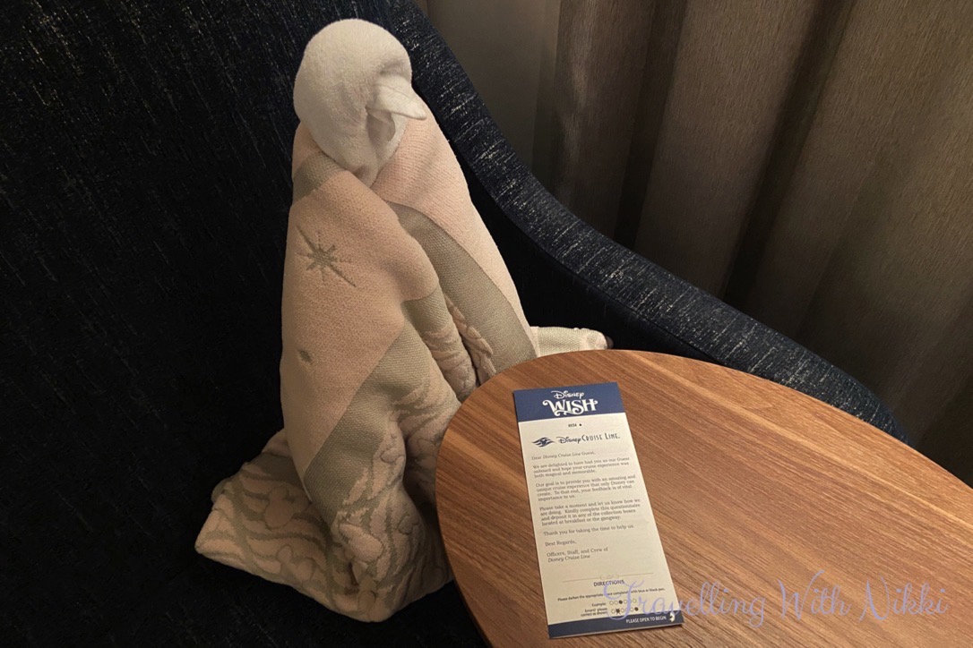 Back in our stateroom we had a blanket penguin and our cruise survey waiting for us along with some Goofy luggage tags if we needed them which we did not as we were staying in the same stateroom for the second cruise – if you are on back to back sailings and changing staterooms you will need to pack all of your bags, write your new stateroom number on the tags, leave the bags in your room on disembarkation morning and your luggage will be moved for you.