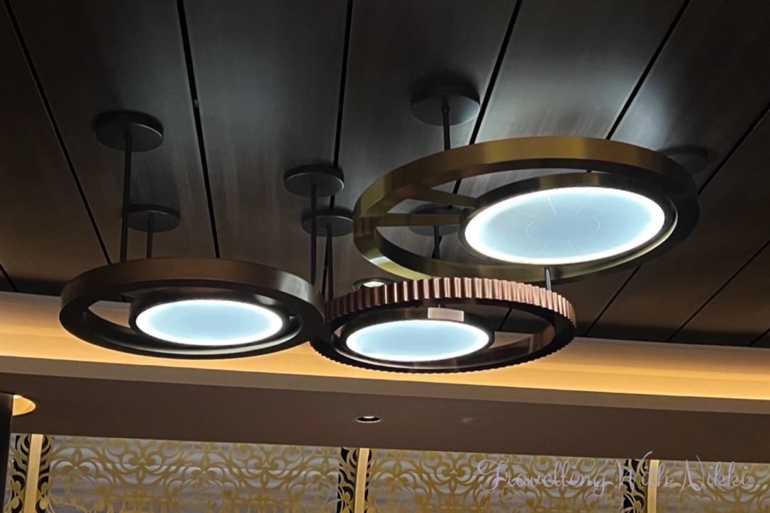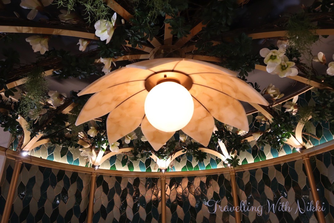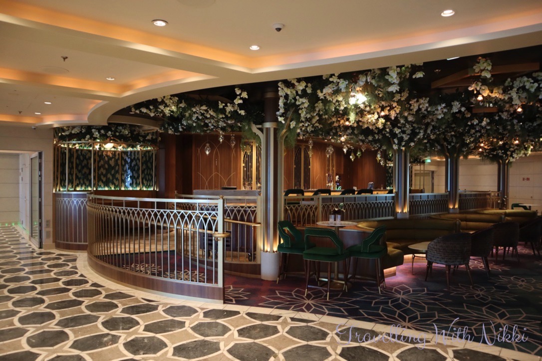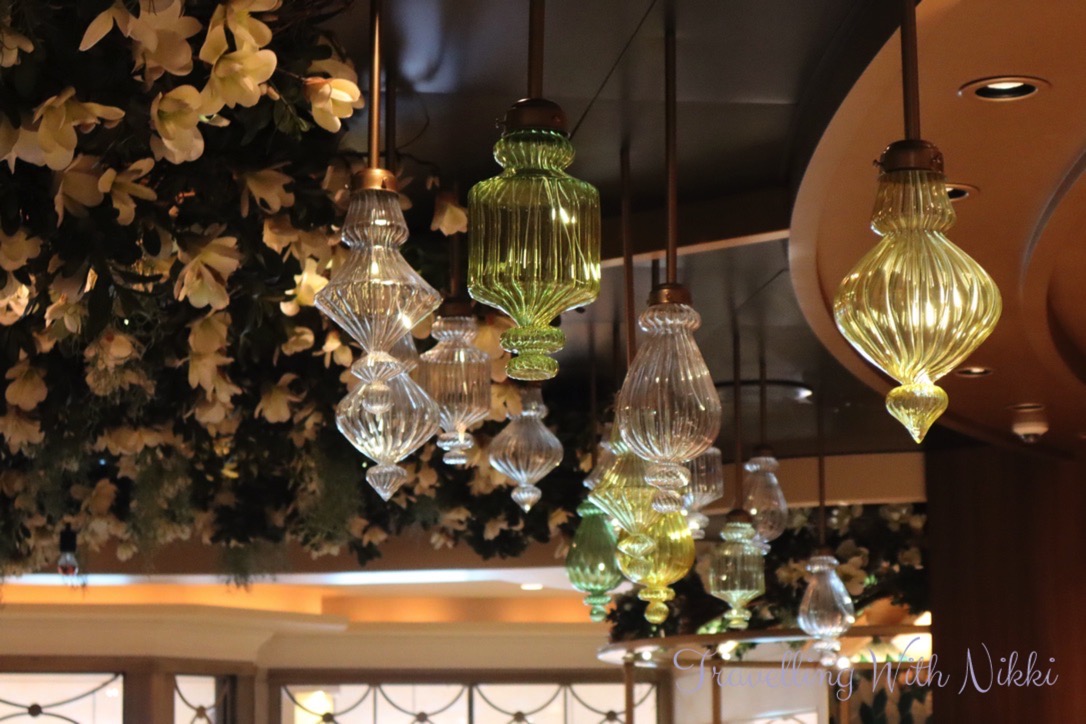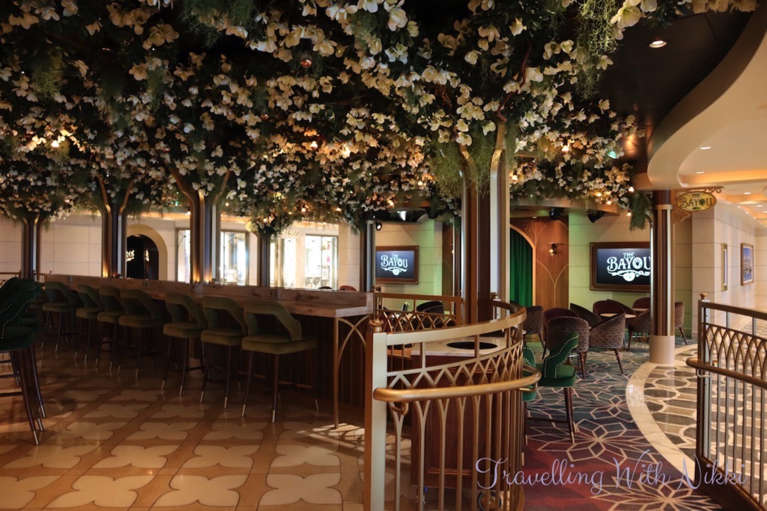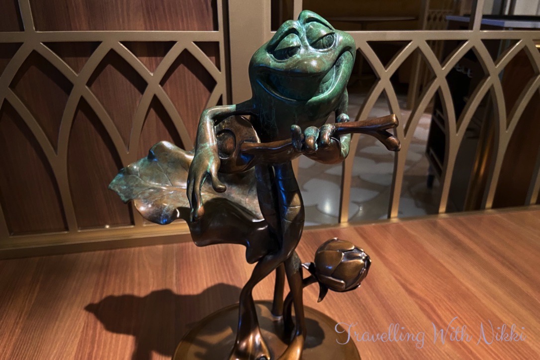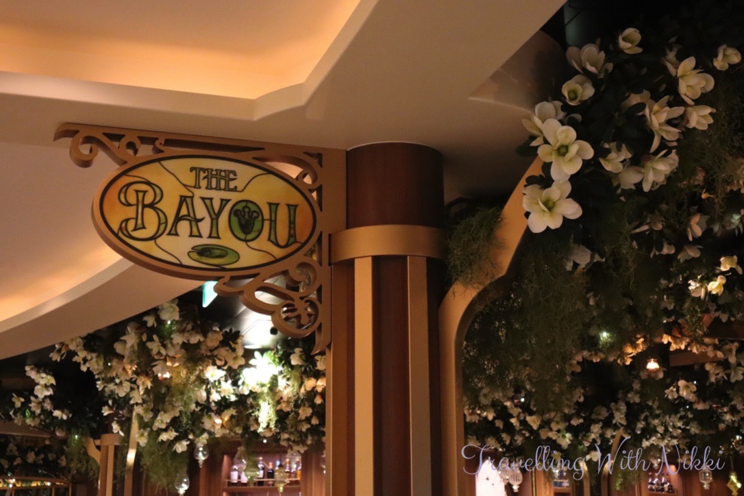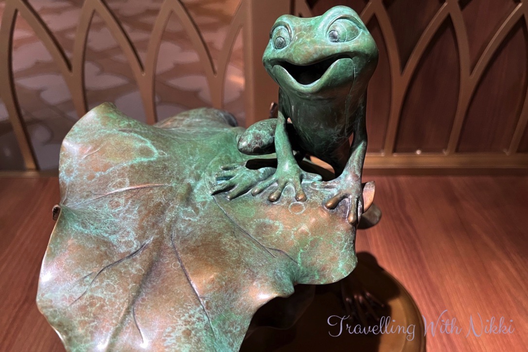 We also noticed that The Bayou on Deck 3 was completely empty for the first time (there was always different activities taking place there every time that we walked past) so we made sure to stop and look around at the beautiful decor inspired by the Princess and the Frog including the flower ceiling as well as all of the details including the Princess Tiana and Prince Naveen frog statues and the silhouette of the Tiana’s Palace restaurant behind the bar.