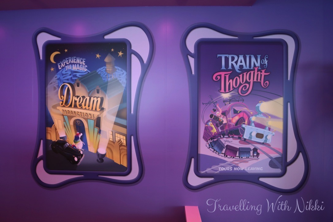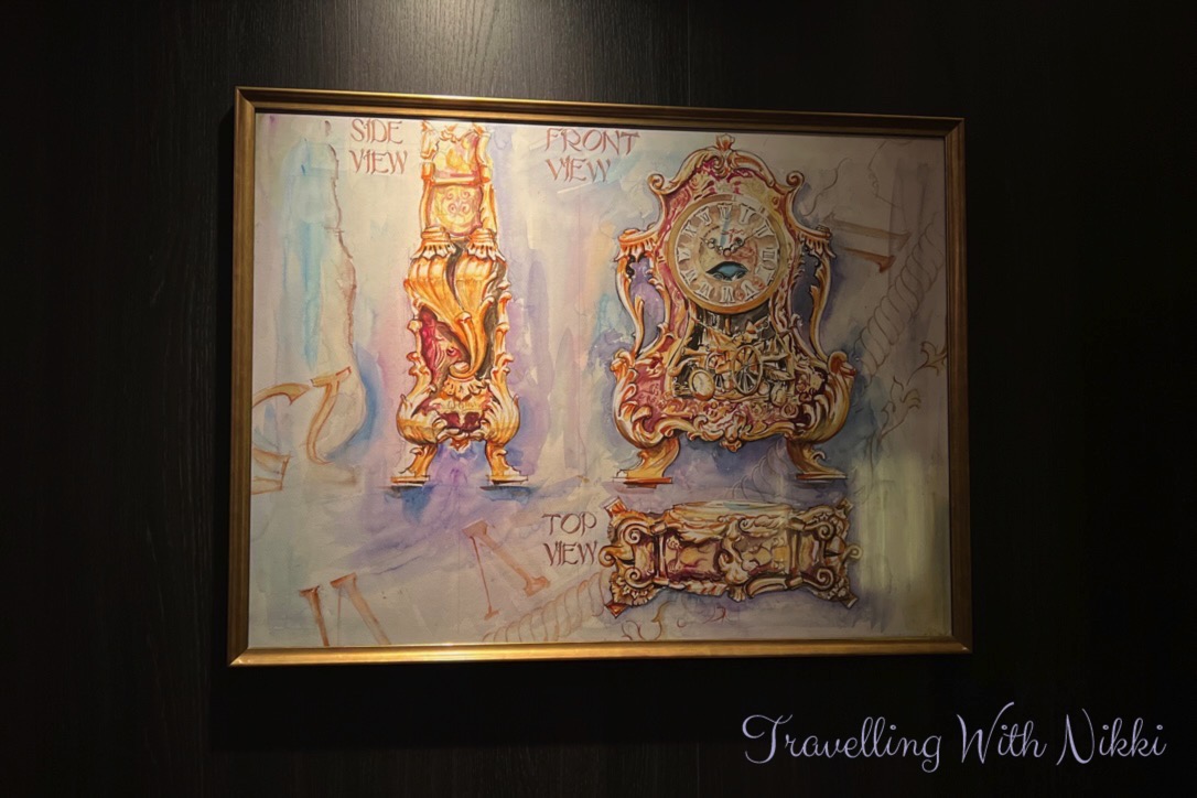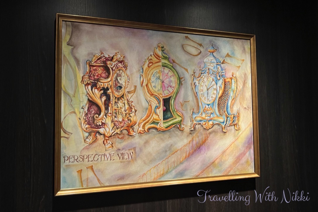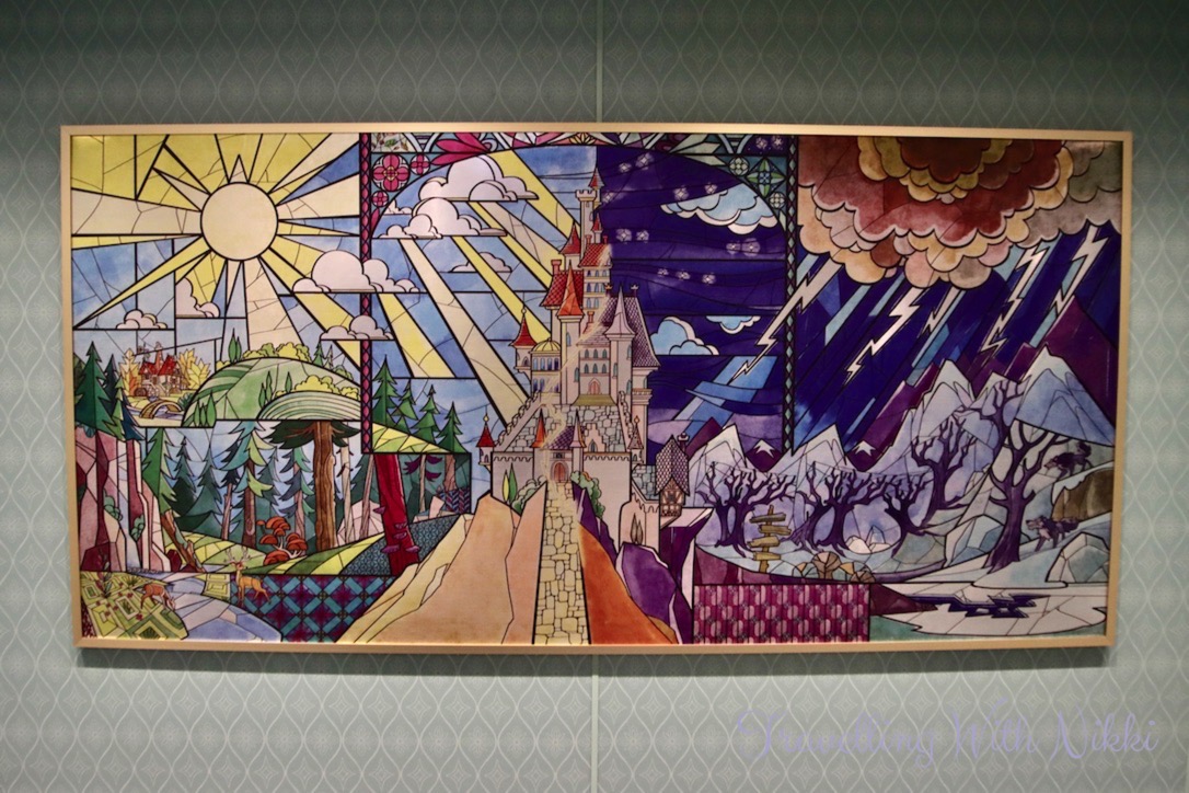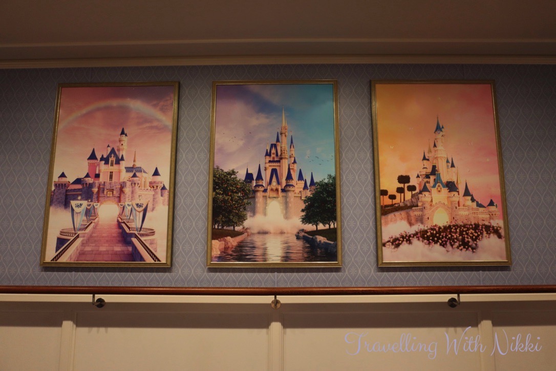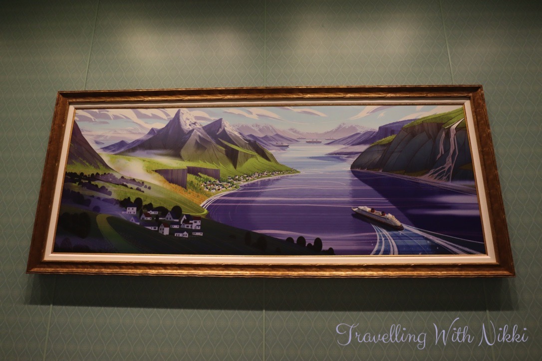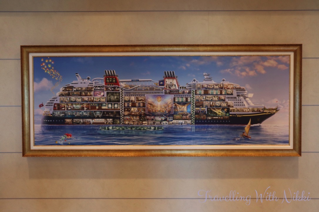 We also used this time to look at all of the different artwork onboard including the cross-section of the ship that can be found in the corridor opposite the high end shops on Deck 3 as well as others that are located in each stairwell on every floor. I especially loved the “Disney Wish joins the Disney Cruise Line Fleet” piece as you can see the Disney Wish sailing off to meet the other four ships in the background.