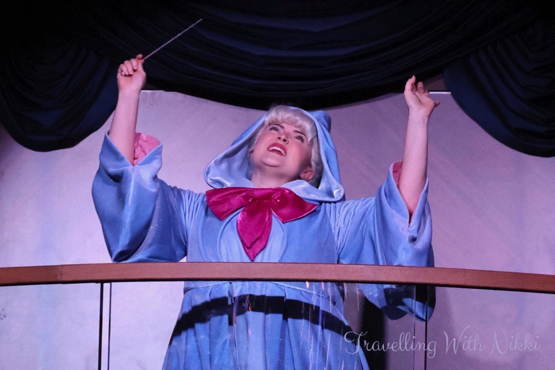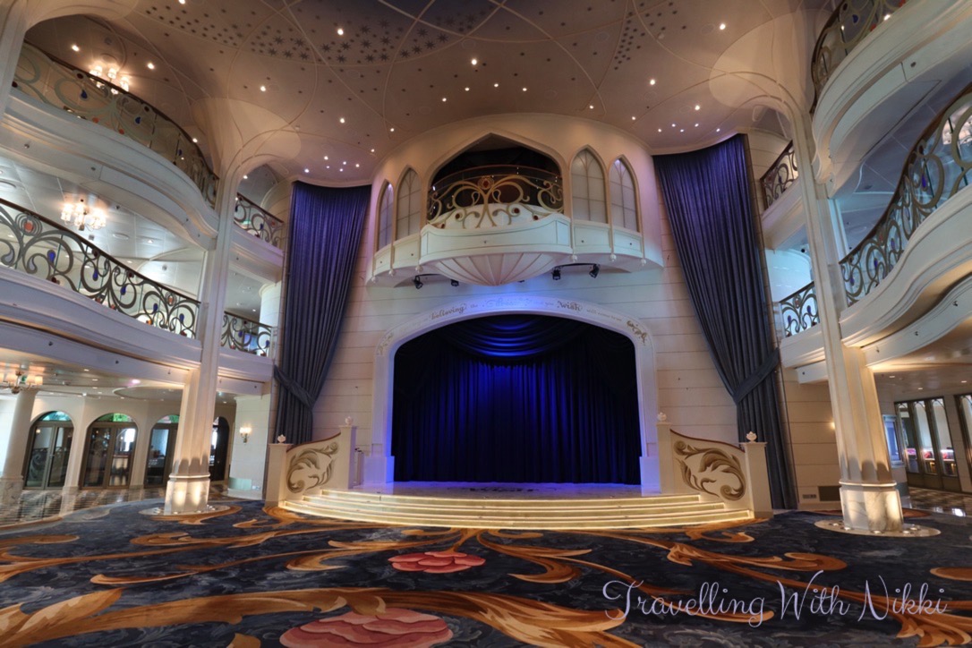 After watching the Disney Dream disappear off into the night, we walked down to Deck 4 of the Grand Hall to watch the beautiful Kiss Goodnight one last time before grabbing a spot ready to watch WISHing Ever After (the farewell show onboard the Disney Wish) and to see the characters for the final time that week.