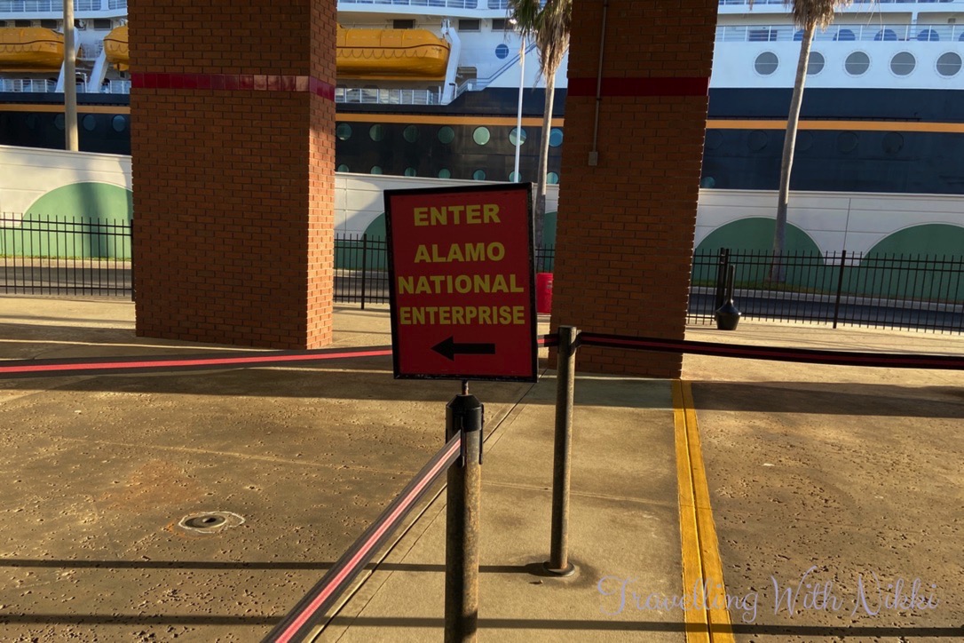 There was a small line of people waiting to disembark the Disney Wish and at 8:10am, we tapped our Key to the World cards as we disembarked the ship for the final time. There was a short customs line and once we were outside the terminal at Port Canaveral, we walked around to Bus Stop 12 where the Alamo Car Rental shuttle is located. We had just missed one shuttle so we had to wait just over ten minutes for them to come back again which was not a problem at all.