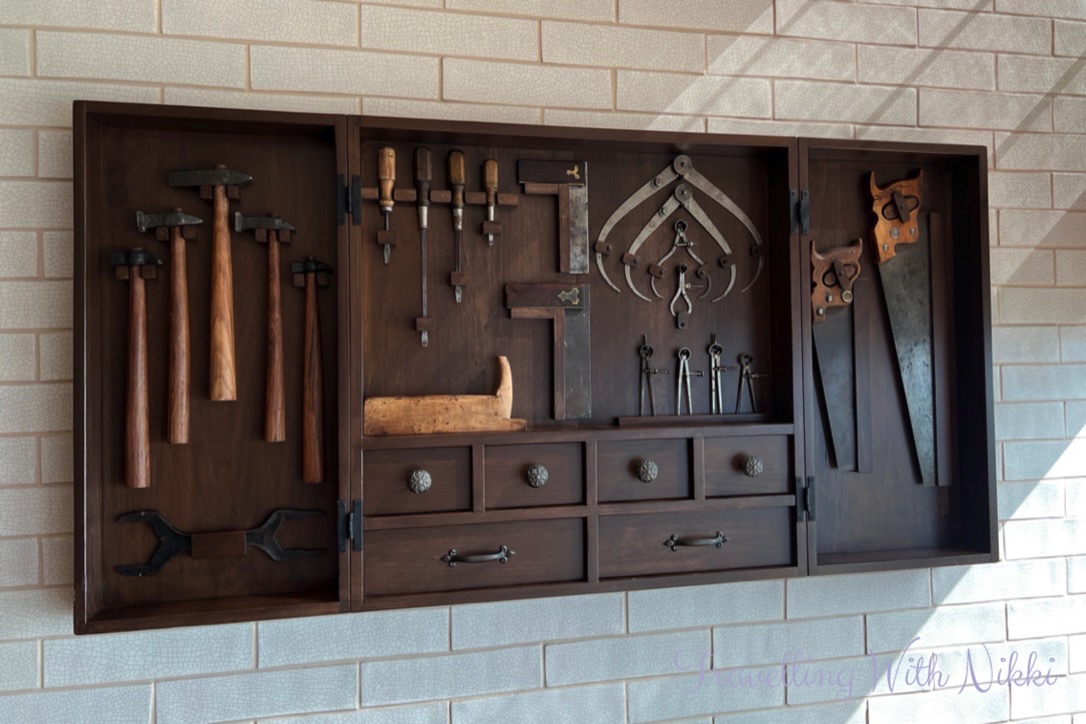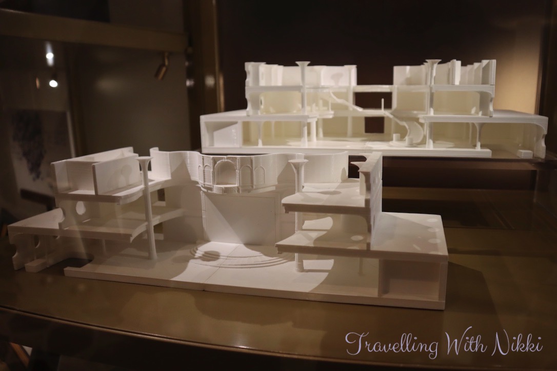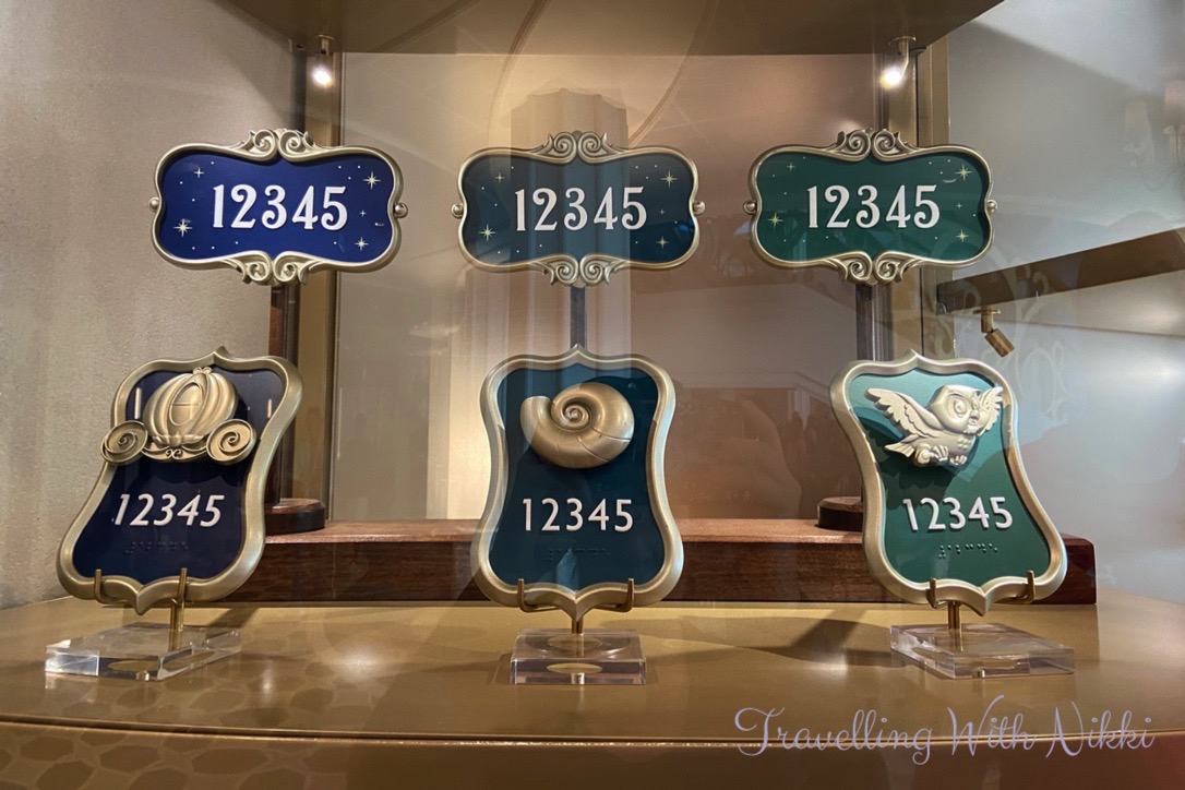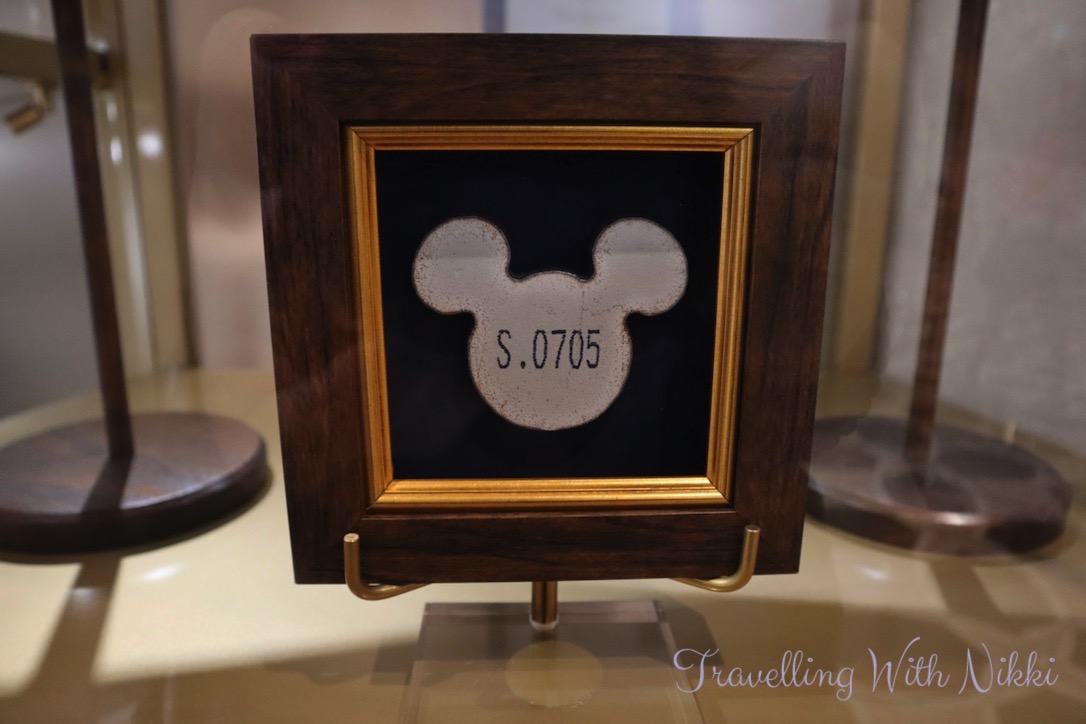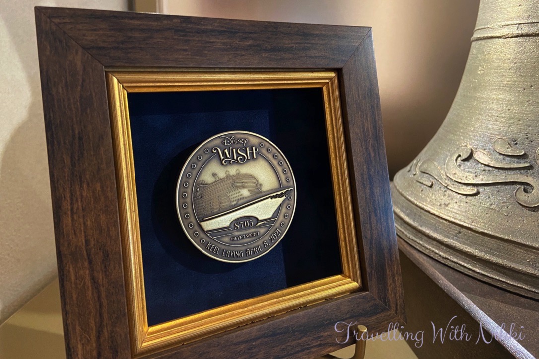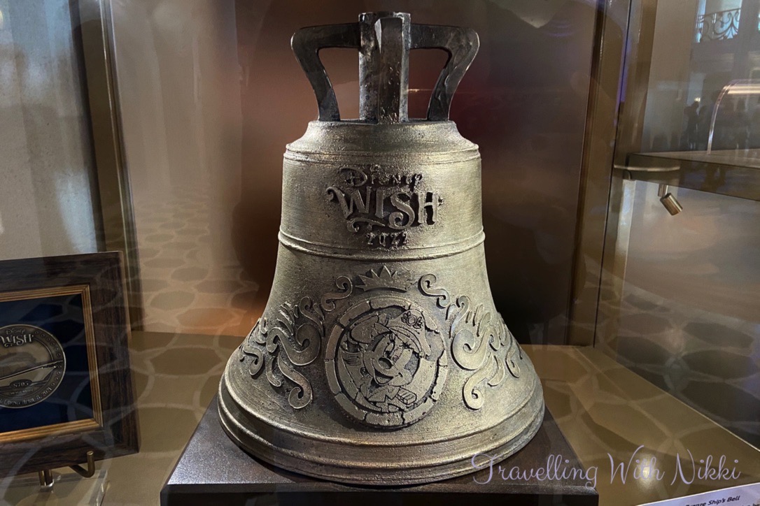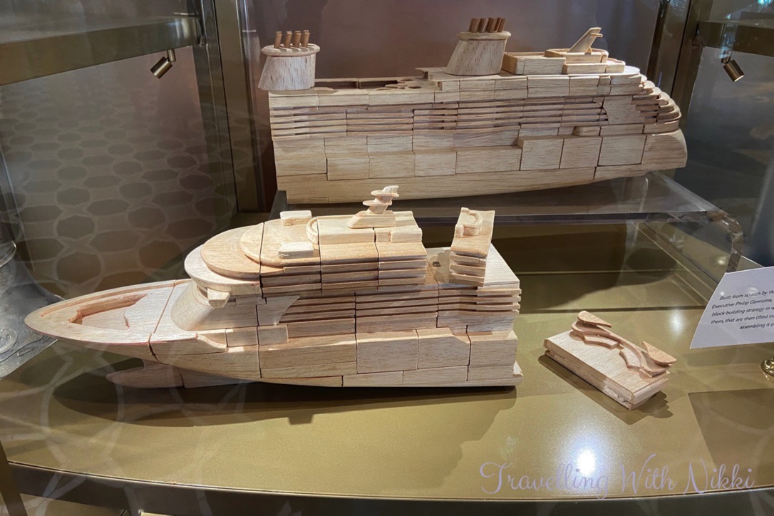 Outside the entrance of 1923 in the Grand Hall are some display cabinets which contain information, details, sketches and artefacts about the design of the ship including a copy of the ship’s bell, the keel coin, the different room number plaques (each floor has a different theme), a model of the Grand Hall as well as the balsa wood model of the Disney Wish that was built by Philip Gennotte which can be seen in the Disney Plus “Making the Wish” documentary.