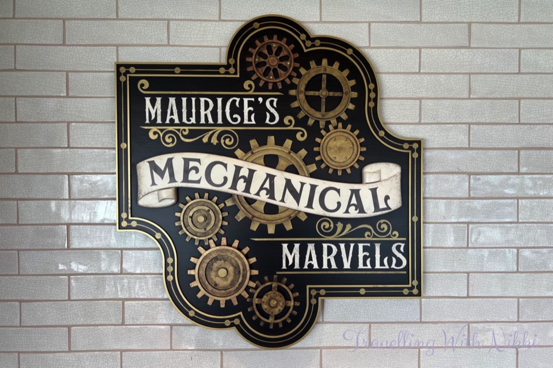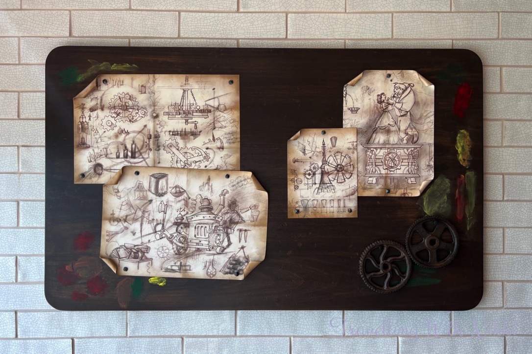 In the Beauty and the Beast area, Maurice’s Mechanical Marvels workshop features blueprints for all of his inventions, his work tools, teapot lights, a display case of clocks and candelabras as well as sheet music for Beauty and the Beast.
