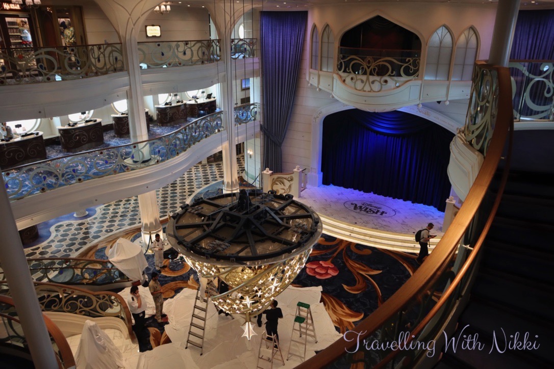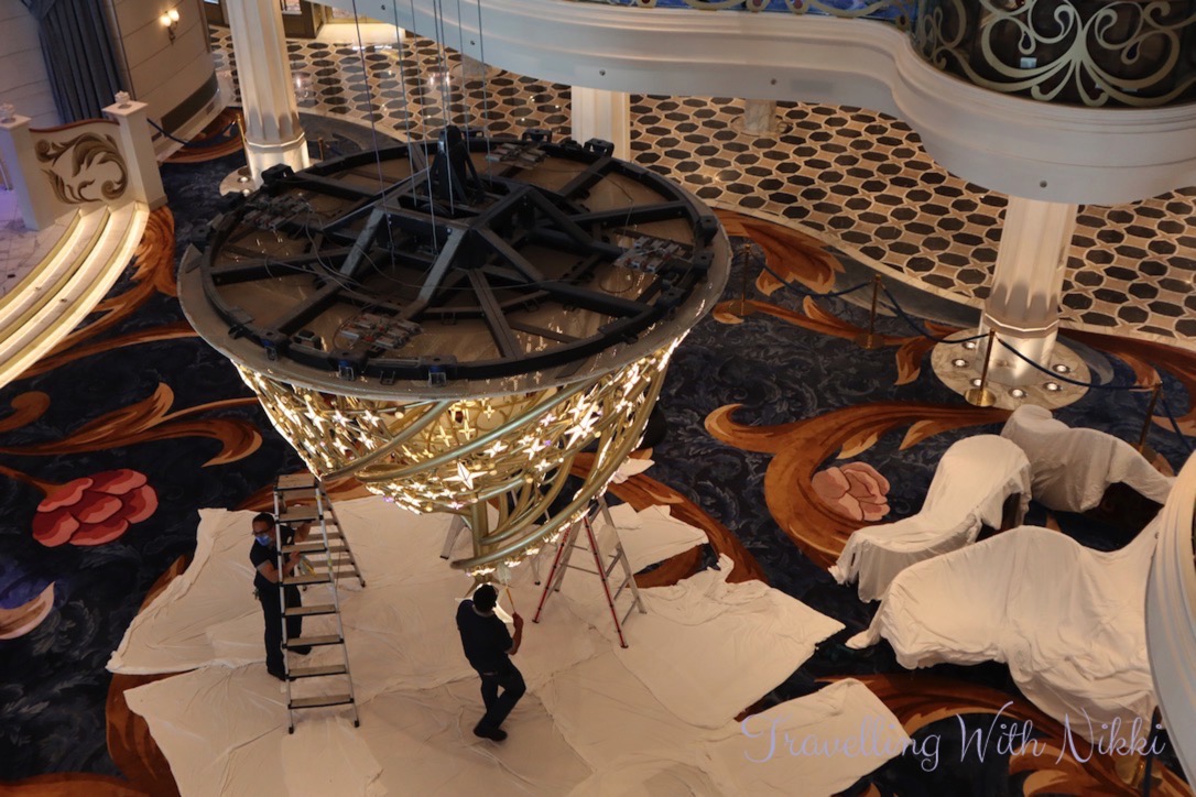 After leaving Marceline Market, I walked back down to the Grand Hall where all of the chairs as well as the Cinderella statue and glass slipper had been covered in dust sheets as the Wishing Star Chandelier had been lowered from the ceiling to be cleaned. I would have always assumed that this would be done overnight or between cruises so it was a great surprise and it was really interesting to see.
