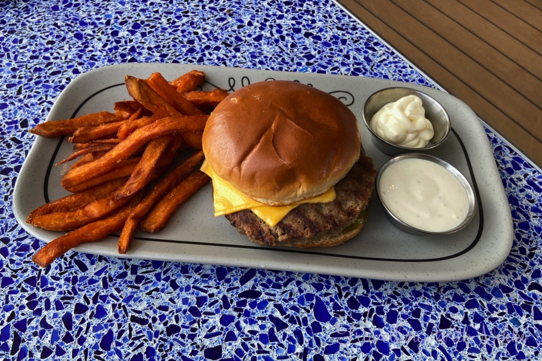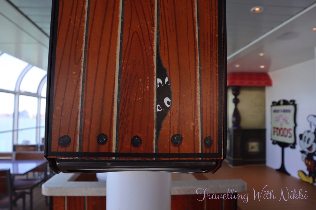 I decided to get an Impossible Burger from Goofy’s Grill for lunch (it was a lot better – as well as hotter – than the one on Castaway Cay) and it came with Sweet Potato Fries and sitting on one of the tables on Deck 11 with a view of Castaway Cay made it even better. I also noticed Chip and Dale hiding in one of the napkin dispensers at Mickey and Friends Festival of Foods – those two chipmunks get everywhere especially if food is involved!