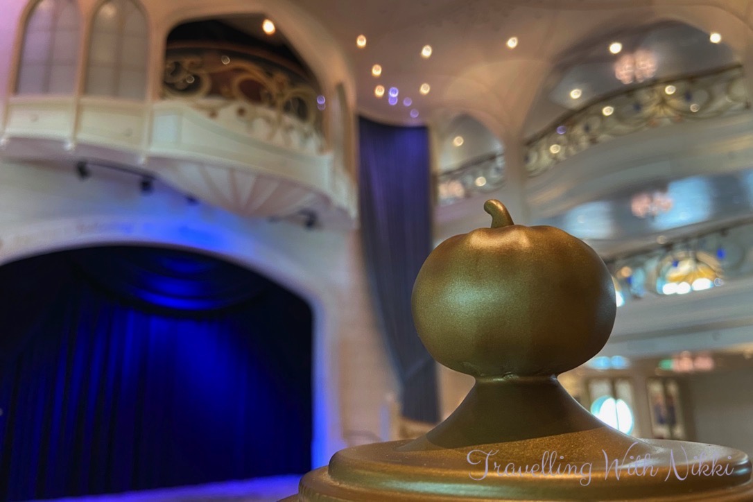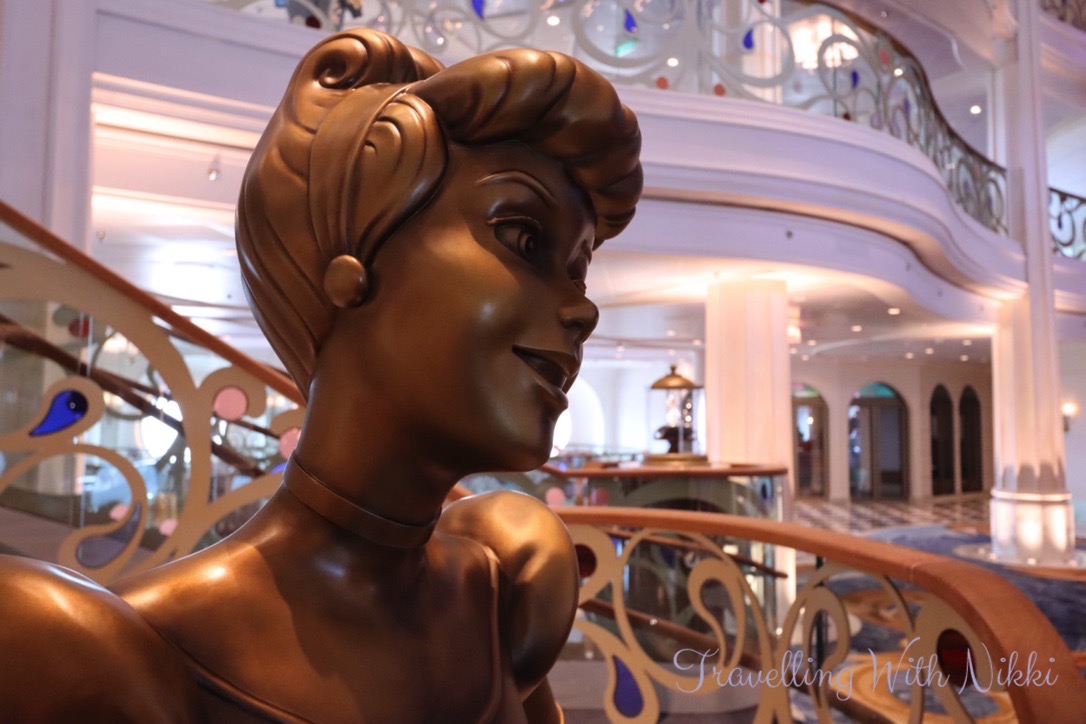 Whilst heading down to the gangway, we walked through the Grand Hall again and spent a few more minutes taking some photos without anyone else in them as it was completely deserted. Once again even after a week onboard the Disney Wish, I was still spotting things that I had not noticed yet as there was a small pumpkin on top of the display case which holds Cinderella’s glass slipper.