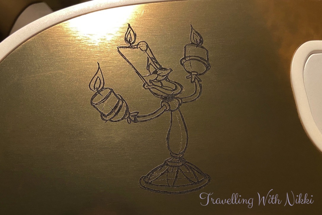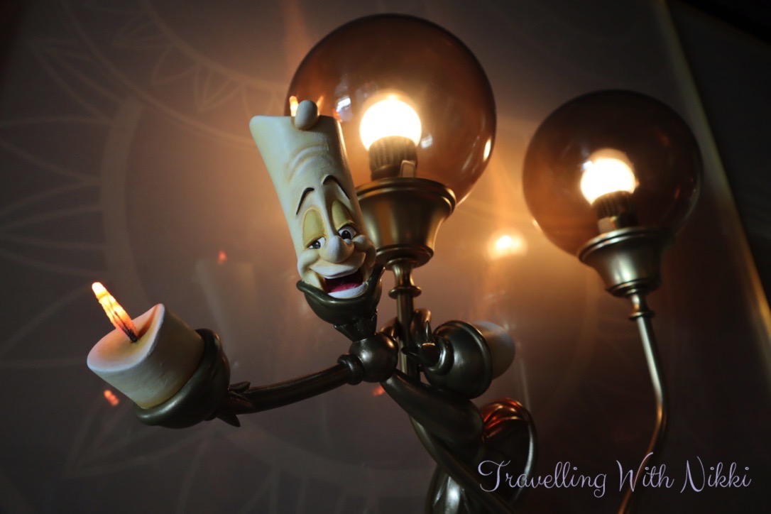 As you enter Enchanté, the first thing you notice is the beautiful and bright chandelier with 397 glowing and flickering gold champagne bubbles which is a reference to Chef Arnaud Lallement who is from the Champagne region of France. Along with the bottles of wine on display are also a collection of different candelabras in honour of Lumiere. Whilst Remy is decorated in a more dark and traditional style, Enchanté is very bright (as it should be with Lumiere in charge) with lots of whites, golds and pale blues used throughout.