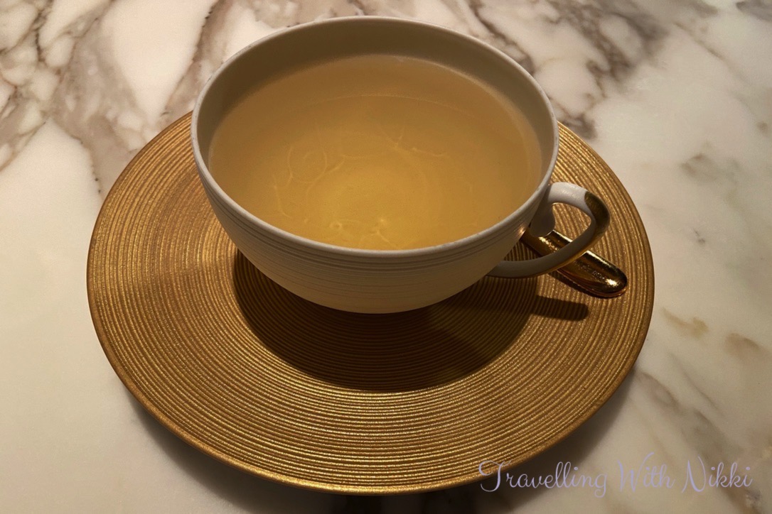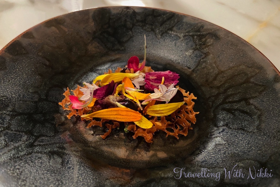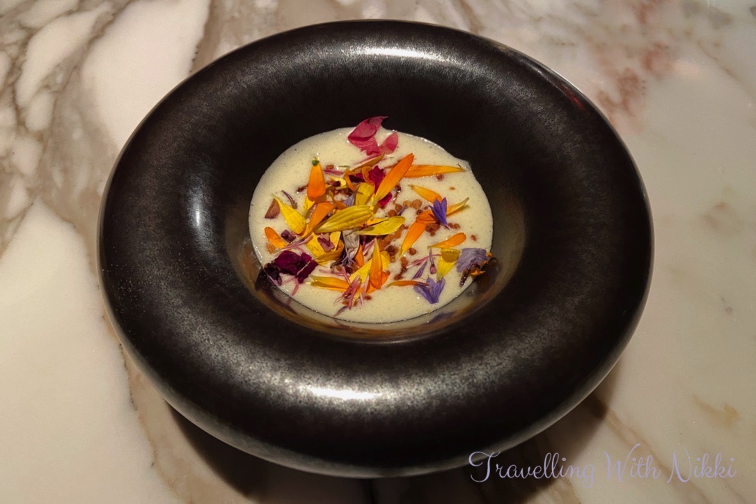 Our amuse-bouche arrived shortly afterwards which was called “Miel” (Honey in French) which was lemon confit, beeswax syphon and edible flowers with a delicate rice flour tuile which was brought out on a separate plate so that it remained crisp until it was placed in the bowl – the presentation and attention to detail was beautiful and it tasted delicious.