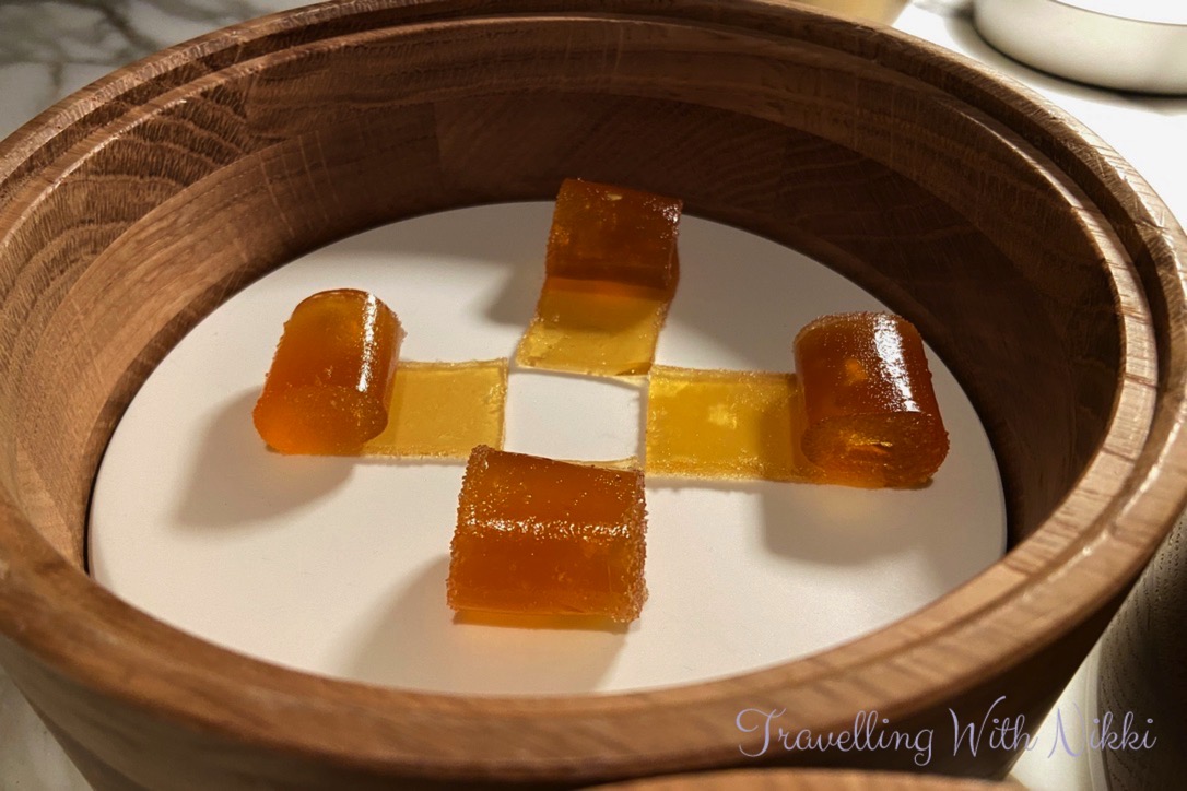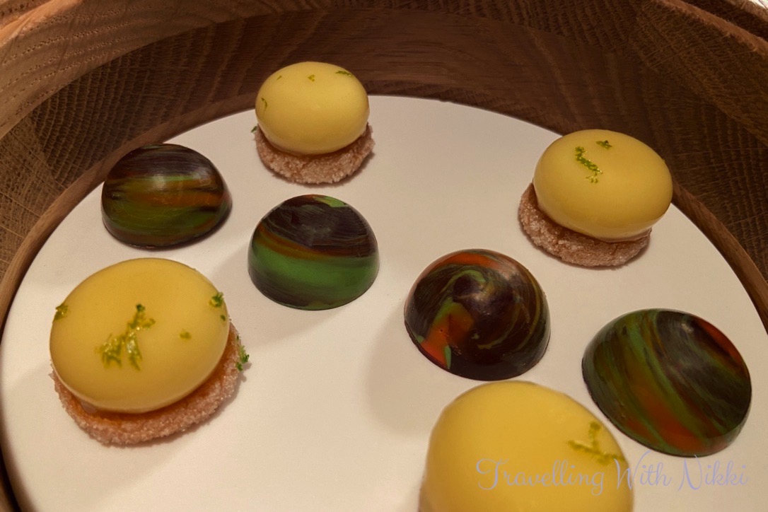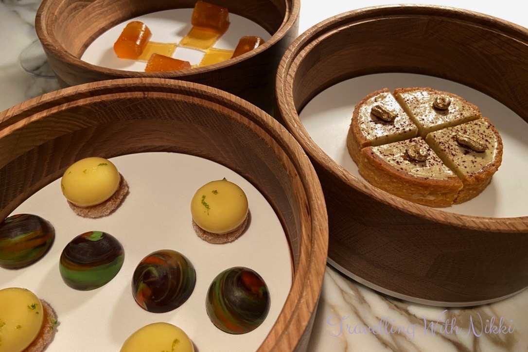 For our mignardises we were served a beautiful and light coffee caramel tartlet, some amazing lemon drops which tasted so fresh and had so much flavour as well as some pineapple pâte de fruits and matcha tea and bergamot chocolates. Even though you are getting extremely full at this point, you still have a dessert course to come – there is absolutely no way you could ever leave Enchanté hungry!