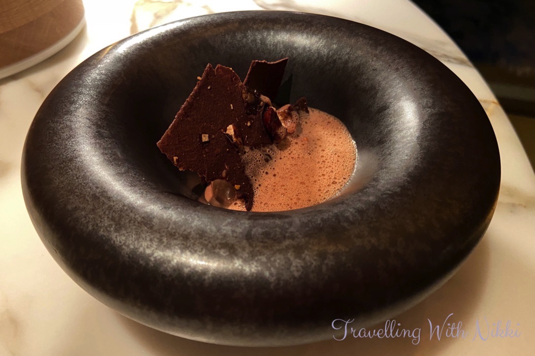 After having gold cutlery placed on the table, we were presented with our dessert which was “Chocolat” consisting of a Louis XV with gold leaf as well as chocolate ice cream served with pieces of praline and Valrhona chocolate and a chocolate foam. This dessert was just incredible and the perfect way to end our meal.