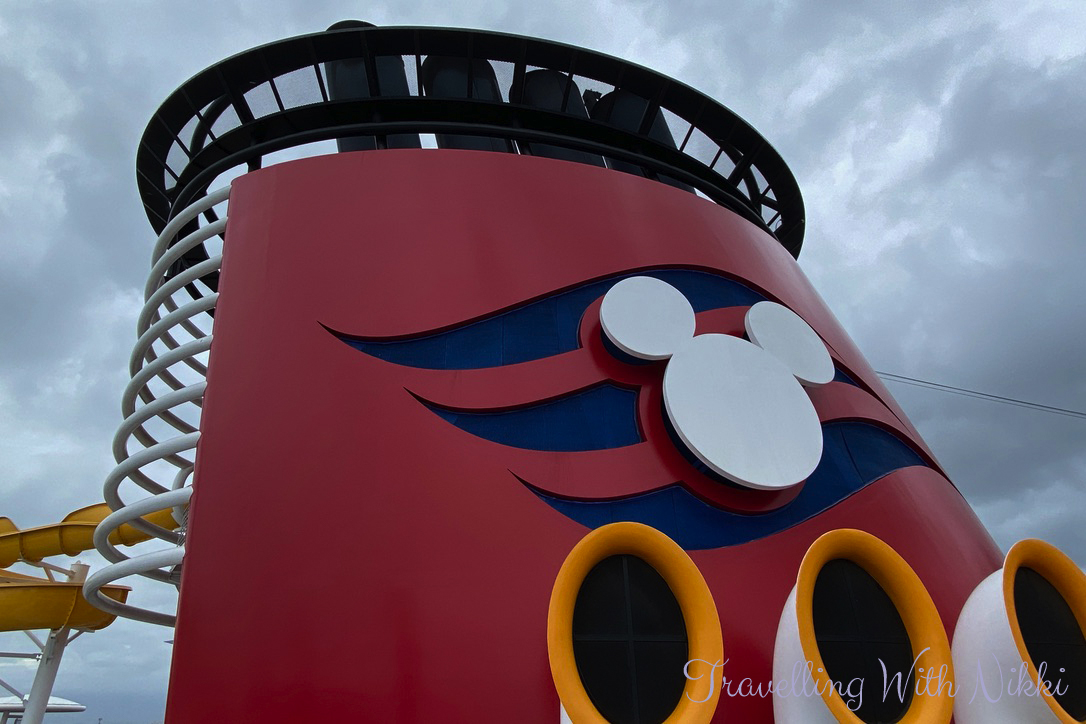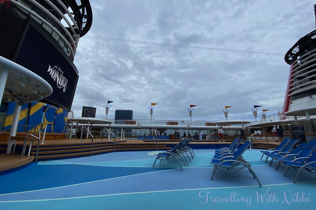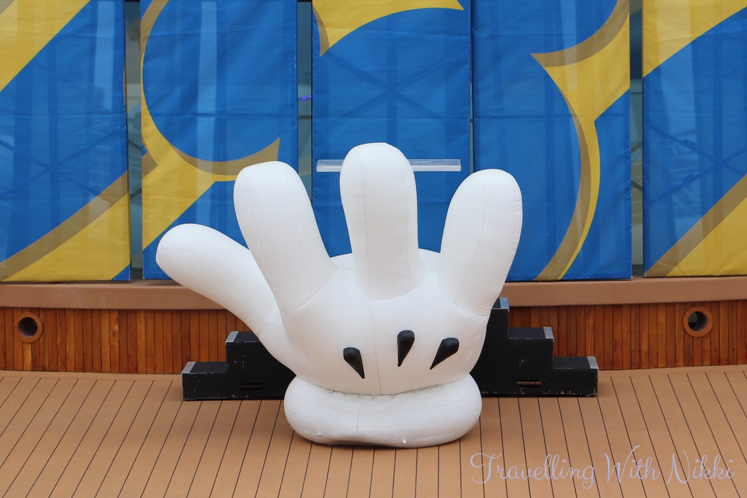 After we had finished our lunch, we walked around a very empty Deck 10. The ship was still so quiet at this time and we wondered whether the cruise was empty or if not everyone had boarded yet – the answer turned out to be a little bit of both. It still felt very surreal that we were onboard and I could not believe that this cruise was finally happening after so long. It was also lovely to see the Deck 9 stage was set up ready for Mickey’s Sail-A-Wave Party later that afternoon.