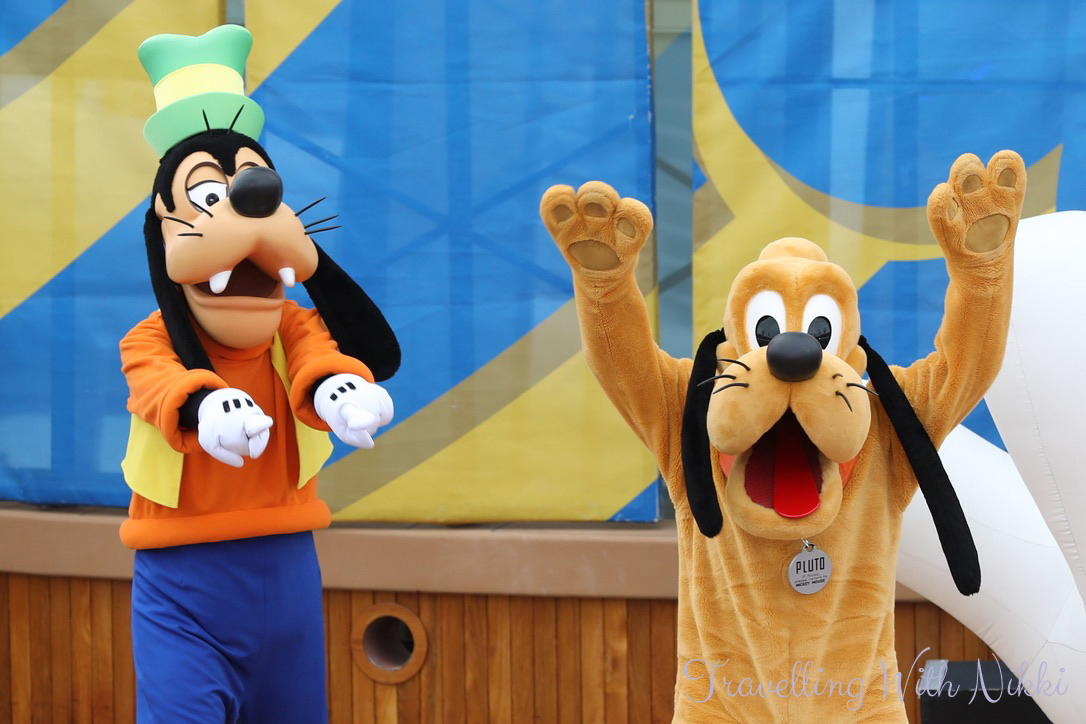 Mickey’s Sail-A-Wave Party starts with the Party Patrol dancing to It’s a Good Time (Get Your Ears On) before being joined on stage by Mickey, Minnie, Donald, Goofy and Pluto.