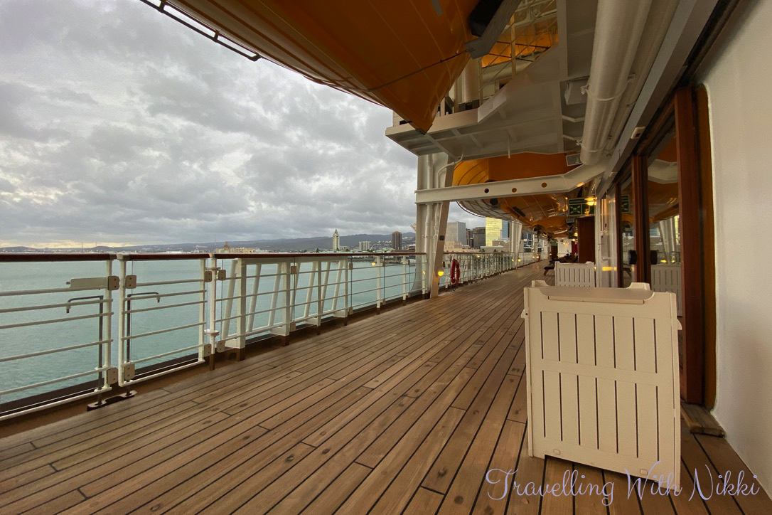 Our test results were checked and as we walked into the check-in area, we were each given a kukui nut lei by the staff from the Port of Honolulu. There were no lines at any of the desks and it seemed very quiet as apart from a large group of embarking crew, there were very few people to be seen. We had already completed the check-in process online so our passports and ArriveCAN QR codes were checked and we were told that we could board straight away as open boarding had already started.