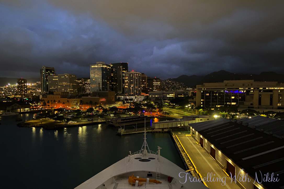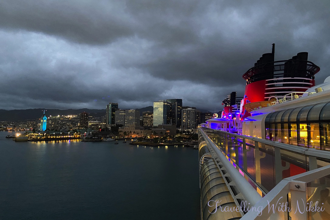 As the sun went down, we walked around the ship and watched as the city of Honolulu as well as the Disney Wonder started lighting up all around us.