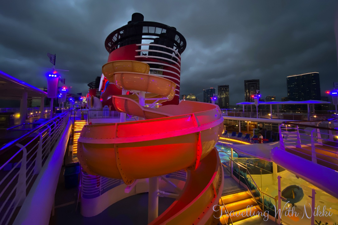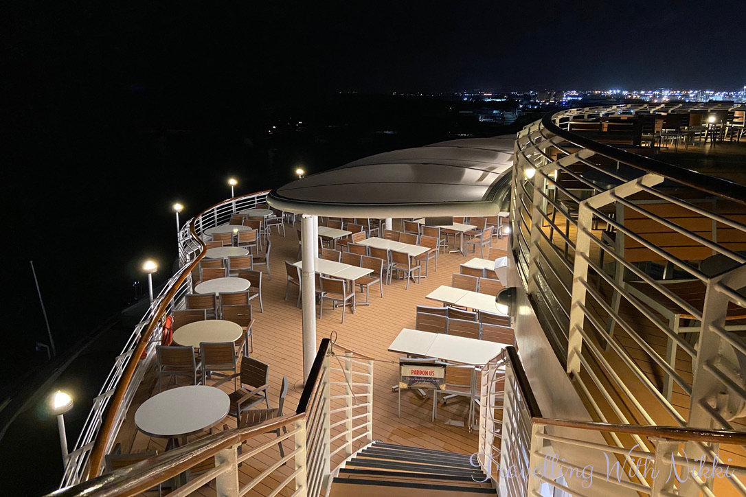 After having no sailaway parties on our previous two cruises, it felt great to have yet another bit of “normality” back again. The Cha Cha Slide then started playing which made me smile even more as I have always joked that I know I’m onboard a Disney ship whenever I hear it playing. After walking around Deck 10, most people had disappeared from the open decks so we sat on a near deserted Deck 9 with a cold drink and a panini from Daisy’s De-Lites as we were both hungry and we still had three hours to wait until dinner.