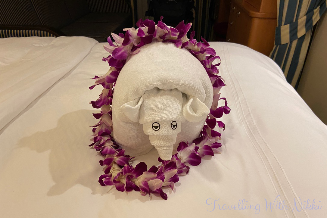 After we had sailed out of Honolulu we were both feeling extremely tired as it was 10:30pm and it had been a very long day as we had been awake since 4:00am. We grabbed a Lemon and Ginger tea from Deck 9 and walked back to our room where we found our first towel animal (wearing one of our leis) waiting for us as well as some new style Galaxy chocolates.
