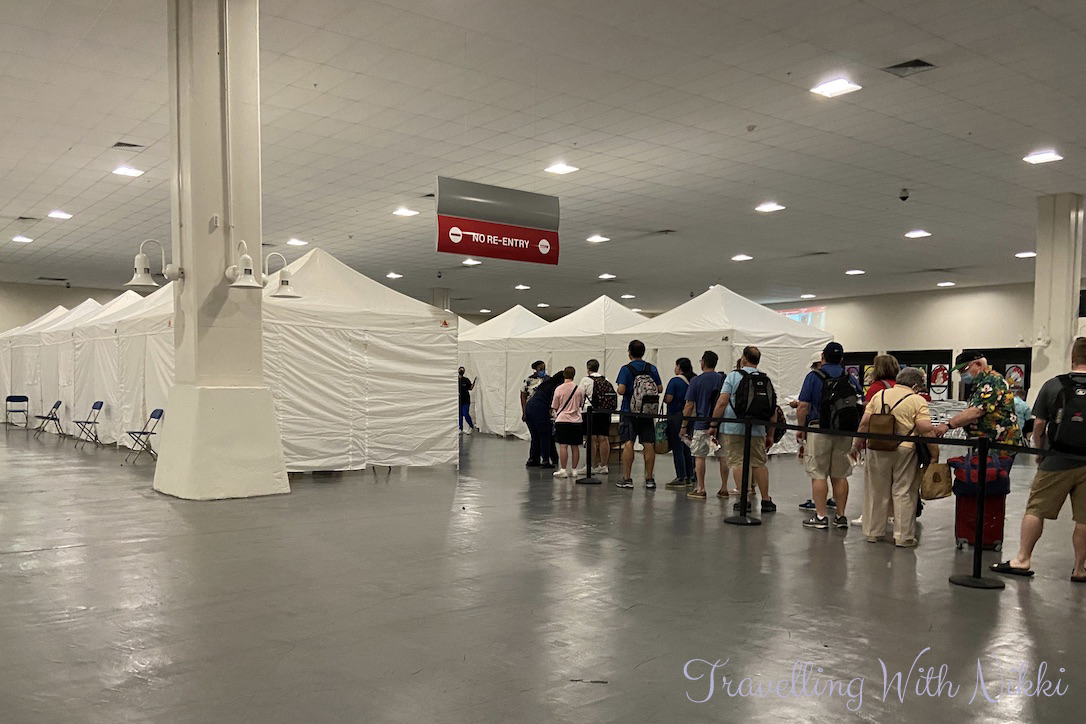 After entering the terminal, we joined a short line where all of our paperwork was checked – we had printed everything out that we could possibly need and placed it all into a display folder making this a very quick and easy process. We then went through the fastest port security I have ever seen before joining another line to have our embarkation tests done. Whilst we were waiting we were handed a form asking us to complete our details on the ArriveCAN app ready for our arrival into Vancouver – I had already set up my account and uploaded my vaccination proof in advance before we travelled so it took me less than two minutes to get the QR code that I needed to show before we could board the ship.