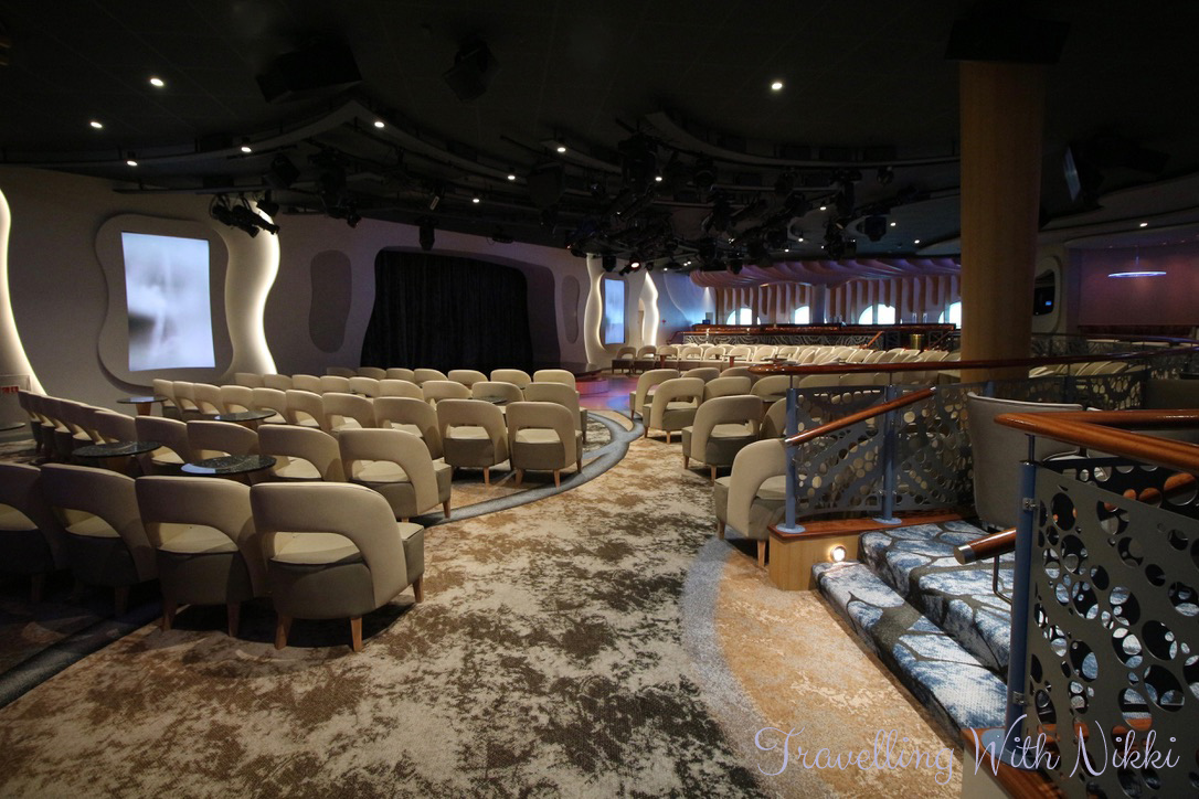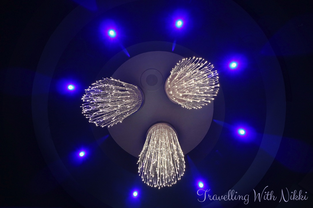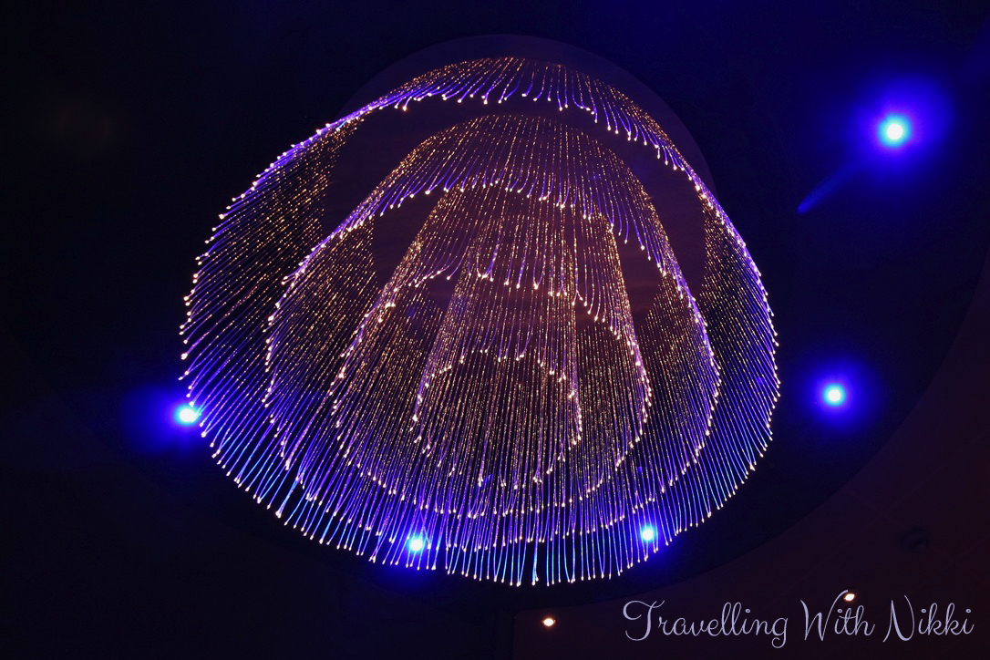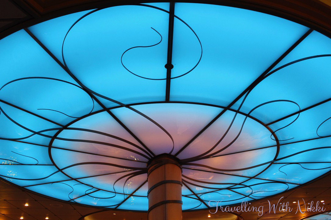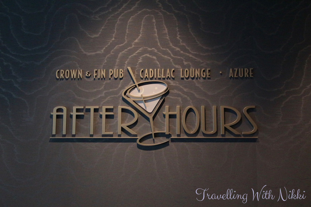 Once back onboard, I walked up the stairs from Deck 1 to the After Hours adult area on Deck 3. It was completely empty so I took a few minutes to look around whilst it was quiet. The last time we sailed on the Wonder, it was called Route 66 and the decor was very loud and in your face but since its reimagining, it is simply beautiful and I loved the chandeliers hanging from the ceiling.
