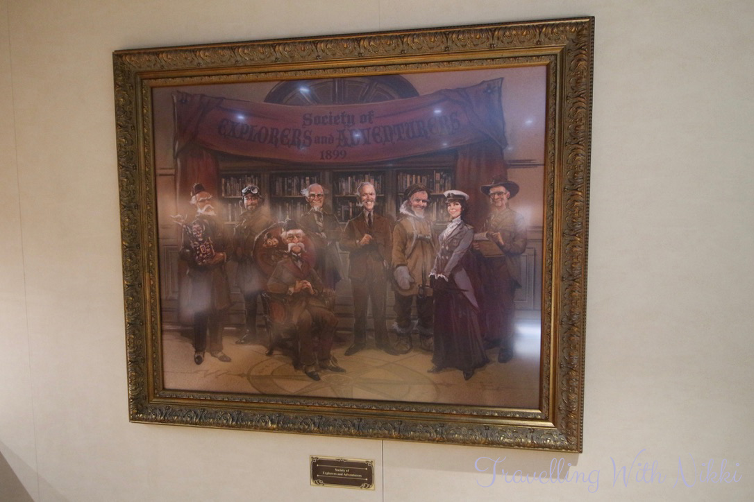 There are newspapers and paintings on the wall of fellow members of the Society of Explorers and Adventurers including Harrison Hightower from Tower of Terror at Tokyo DisneySea and Lord Henry Mystic and Albert the Monkey from Mystic Manor at Hong Kong Disneyland.
