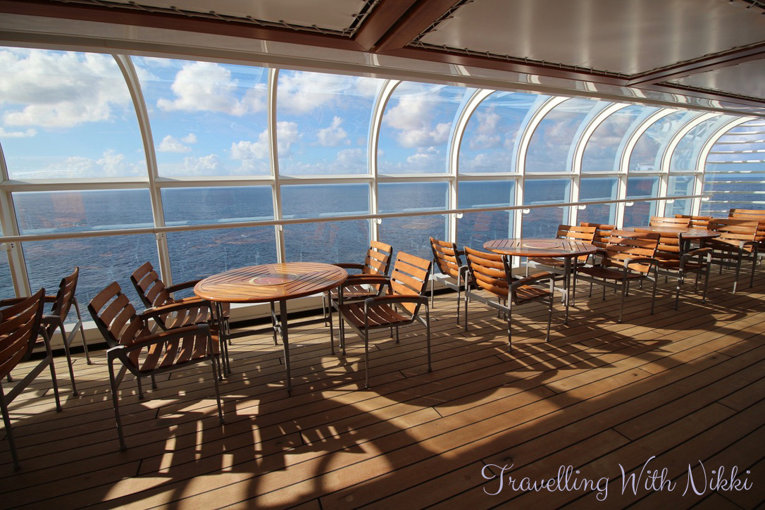 I was starting to feel hungry at this point so after a walk out on an empty Deck 4 with only a view of the ship docked next to ours, I walked up to Cabanas to get some lunch which I then took with me to eat at one of the tables in the shade by the Quiet Cove Pool. It was so peaceful out on the decks and I sat there with my food, a cold drink chatting online to friends and family back home – the 3G signal was a little better than earlier in the day but not great and there definitely was no 4G to be found anywhere.