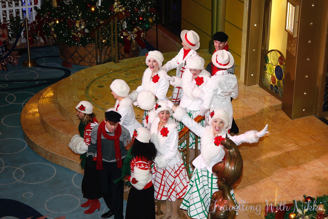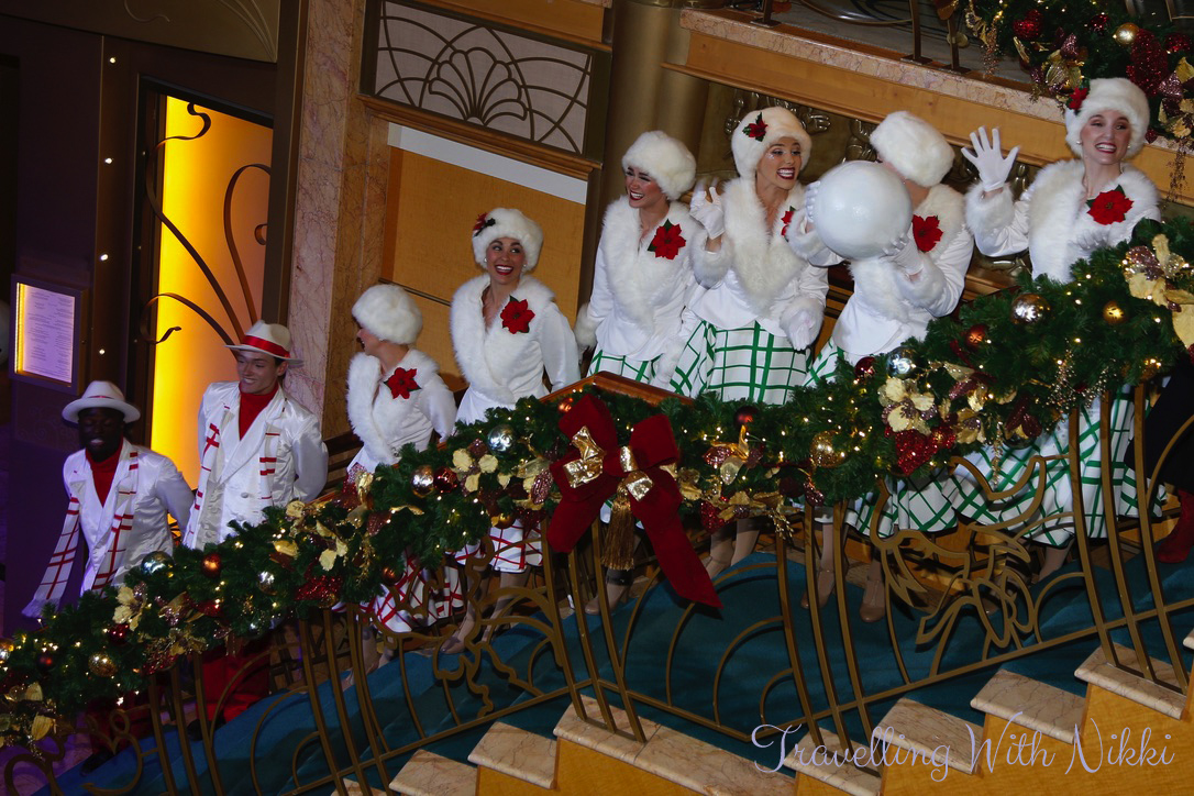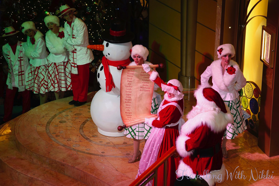 Santa’s Winter Wonderland Ball started with the Walt Disney Theatre performers appearing and singing and dancing to Walking in a Winter Wonderland, Sleigh Ride, I’m Dreaming of a White Christmas and Frosty the Snowman. Santa Claus arrived and introduced Mrs Claus (who had always wanted to see the Caribbean) who was carrying the Naughty and Nice list – Mickey, Minnie, Pluto, Goofy, Daisy and Chip and Dale was all on the Nice side whilst Captain Hook, Ursula, Gaston and Grumpy were all on the Naughty side.